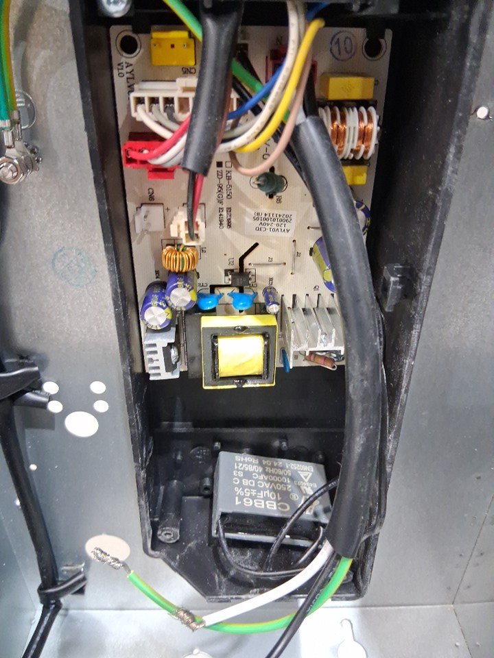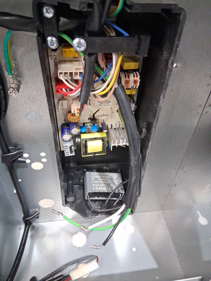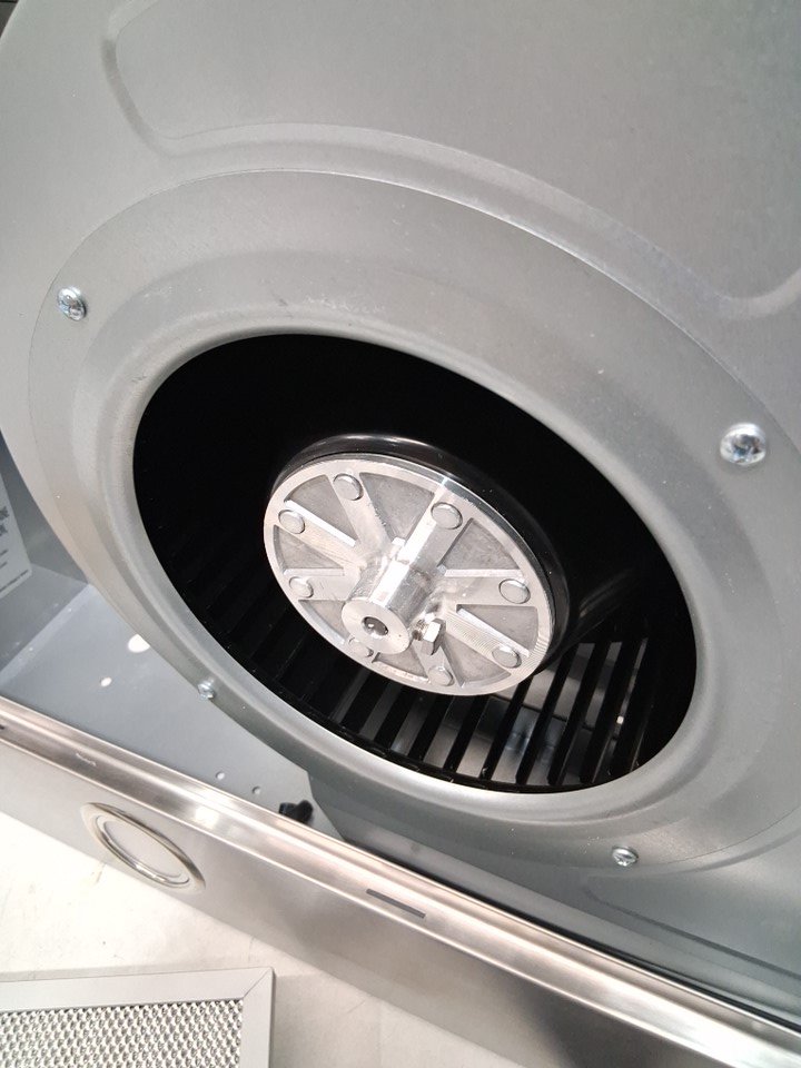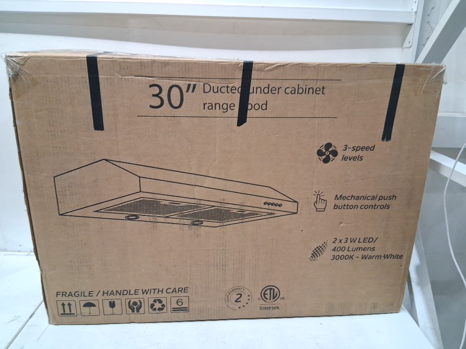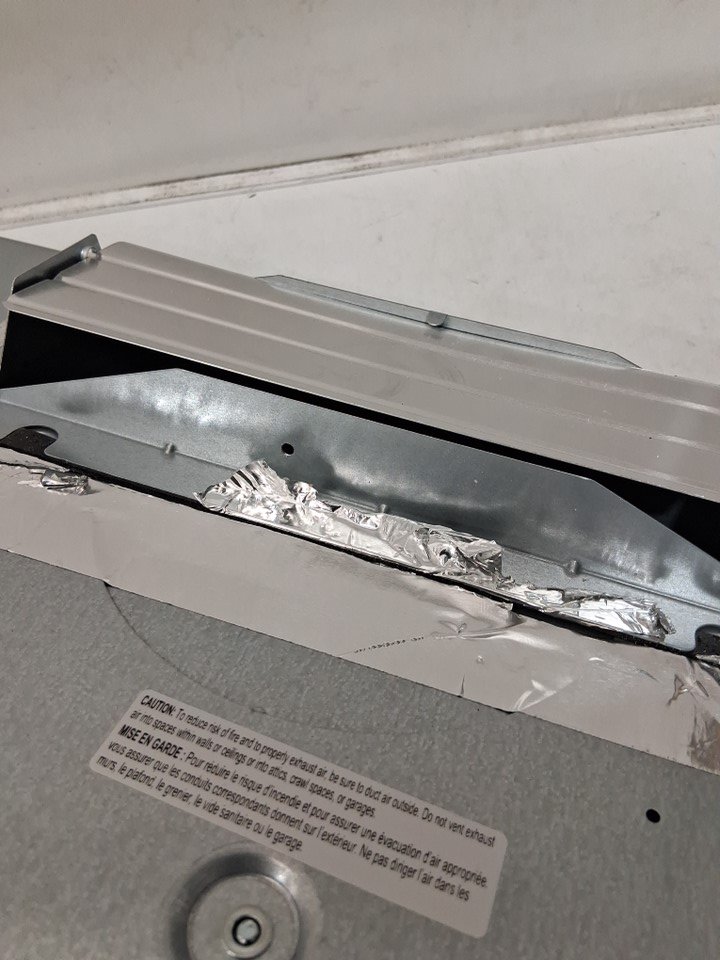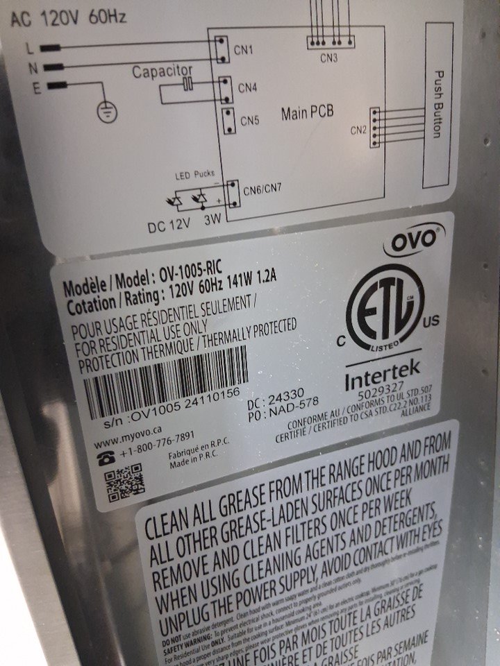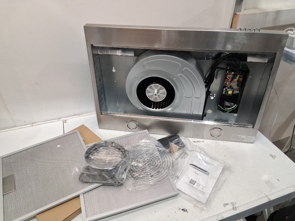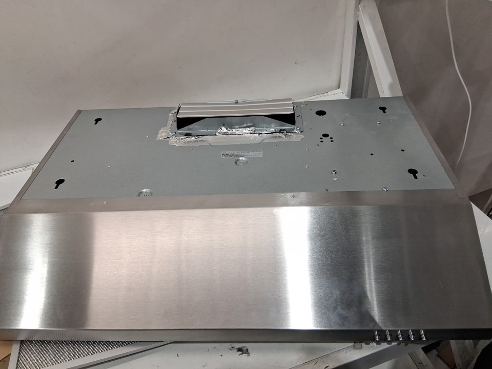 Signs of assembly due to electrical panel is removed. The cover may need additional generic hardware to close. Upper section of the hood has foil tape on it. Cannot test due to the nature of the product.
