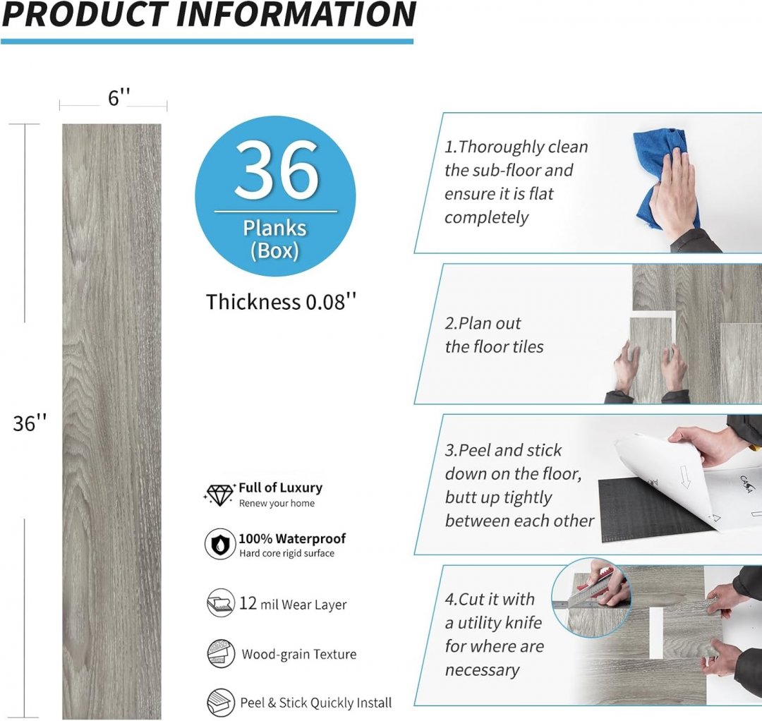 36PK Art3d Peel and Stick Floor Tile Vinyl Wood Plank 36" X 8" - Light Grey (MODEL: A43002)