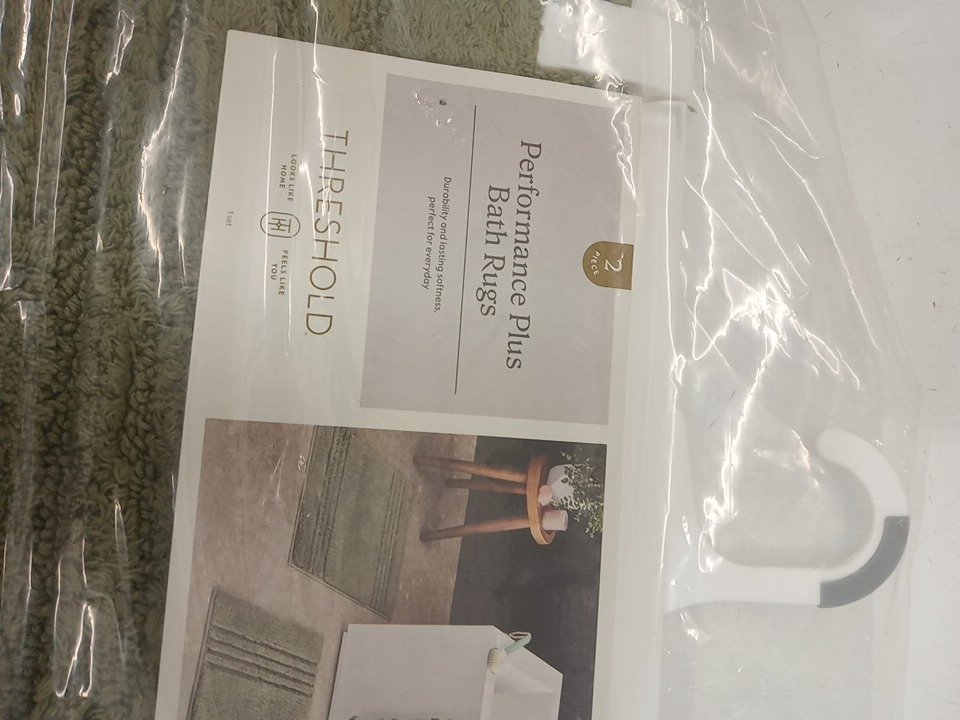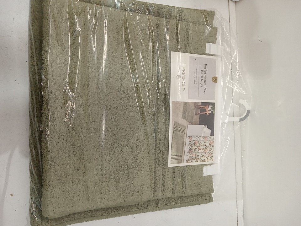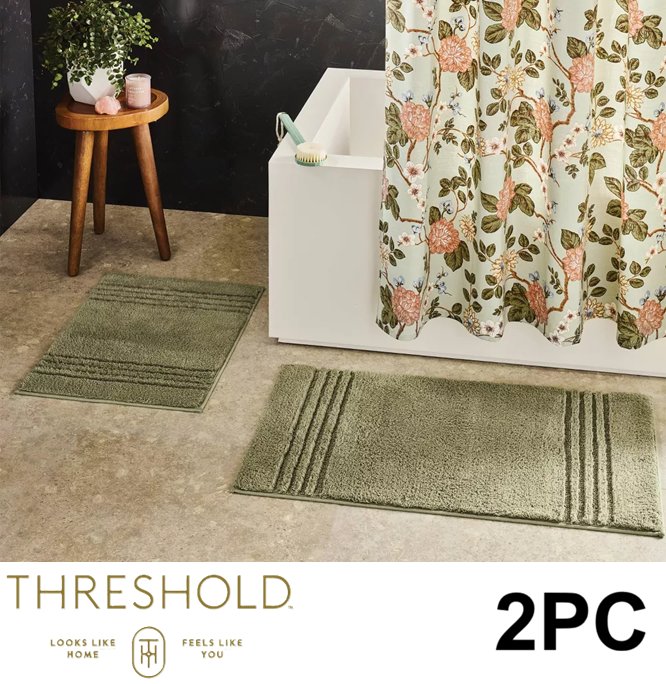 2PC THRESHOLD PERFORMANCE PLUS TEXTURED COTTON STRIPED NON-SKID BATH RUG SET - 17" X 24" / 20" X 34" - MOSS GREEN
