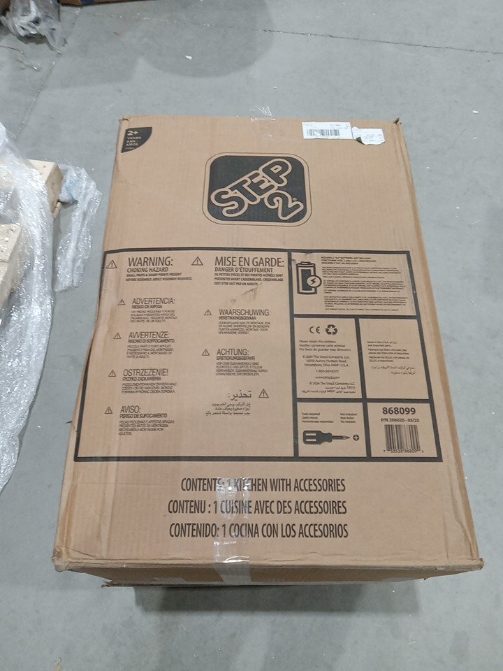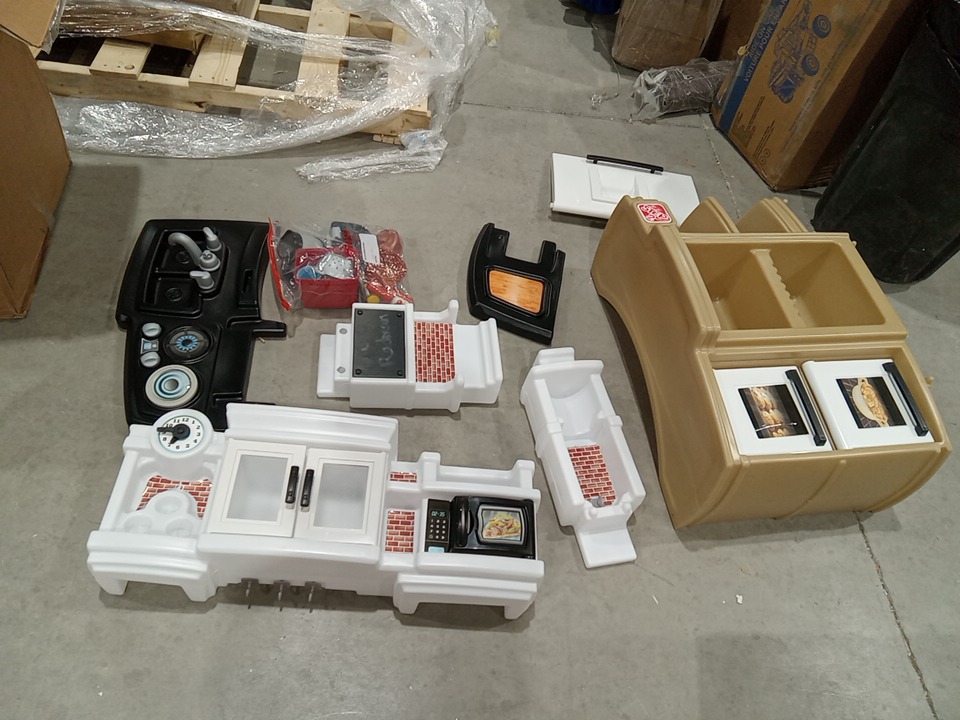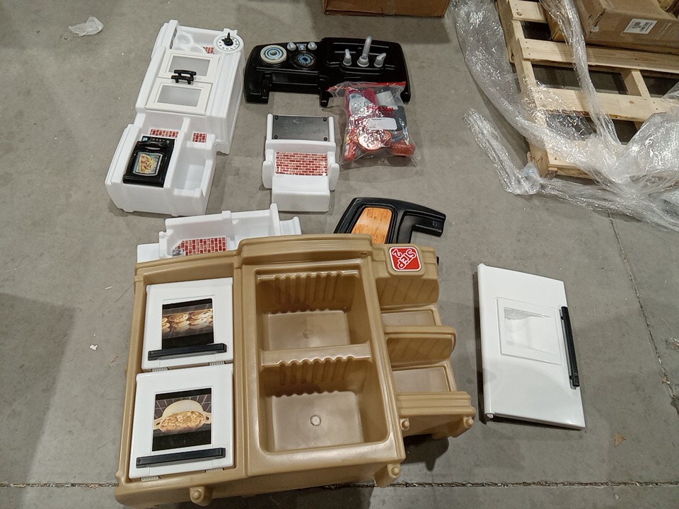 Upon inspection we have found that the manual for this item is missing meaning we are unable to confirm if all the vital parts for assembly are present, however it does seem that the vital parts for assembly are present, if not all the vital parts for assembly are present, their are spare parts available on the retail site ( https://www.step2.com/products/868099-repg?srsltid=AfmBOor-3pNyJRmKqHRsqOwAlbN-NuWvX7YLt820qIgvIklFK8aLCY3v) these can be acquired in case their are any missing pieces, one of the plastic burners for the stove top is slightly popping out and their is a small decolorization stain on the back of one of the plastic pieces, the decal stickers for this item have already been put on, indicating previous use. the black plastic stope top has some cracks from shipping and handling / previous use. This item has been tested for power and is confirmed to be working. see photos below.