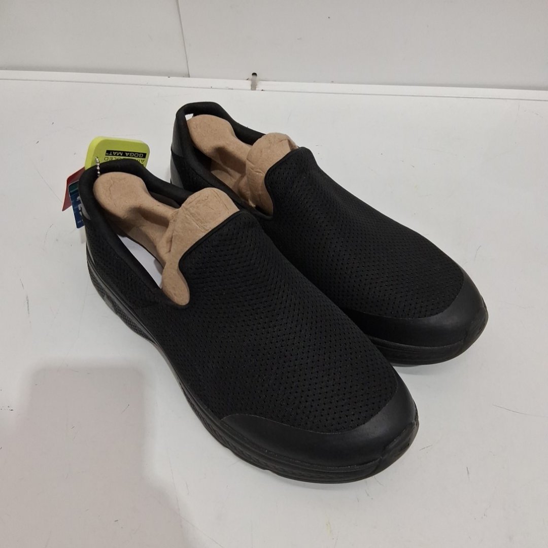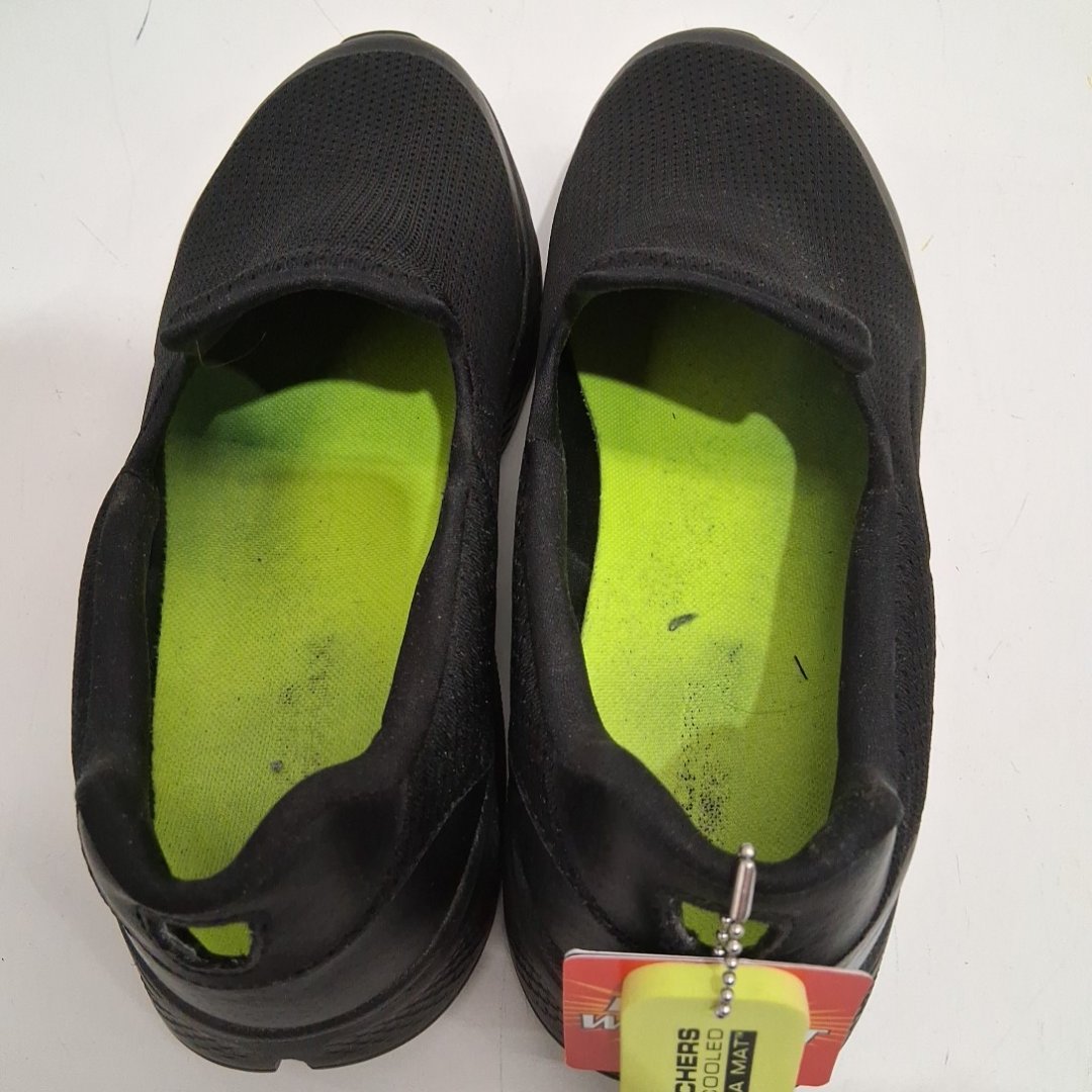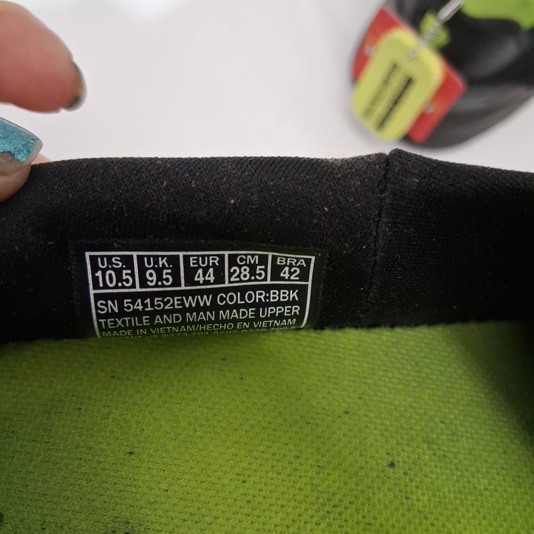 The printing on the soles of the shoes are slightly worn from previous use.