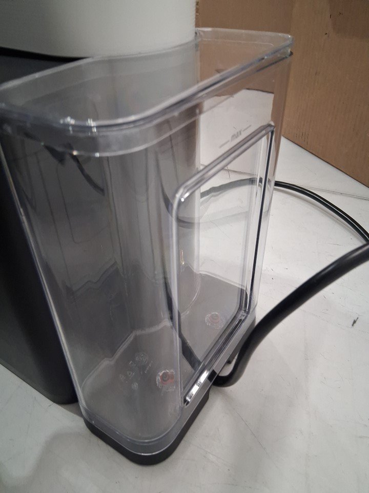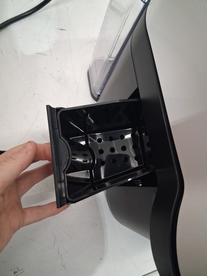nespresso machine has water and coffee spots on it. Is missing drip tray and lights are flashing orange, either machine was stopped during a descaling mode or due to no pod inserted.