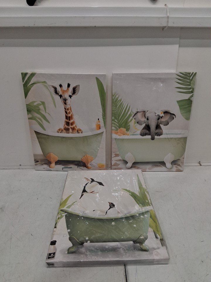 3PC PRINTED CANVAS - 12" X 16" - ANIMALS IN BATHTUB