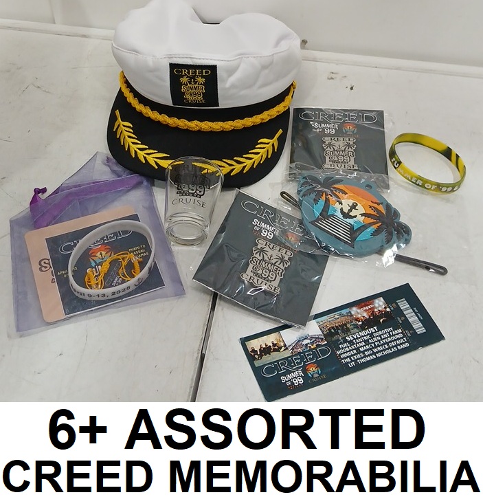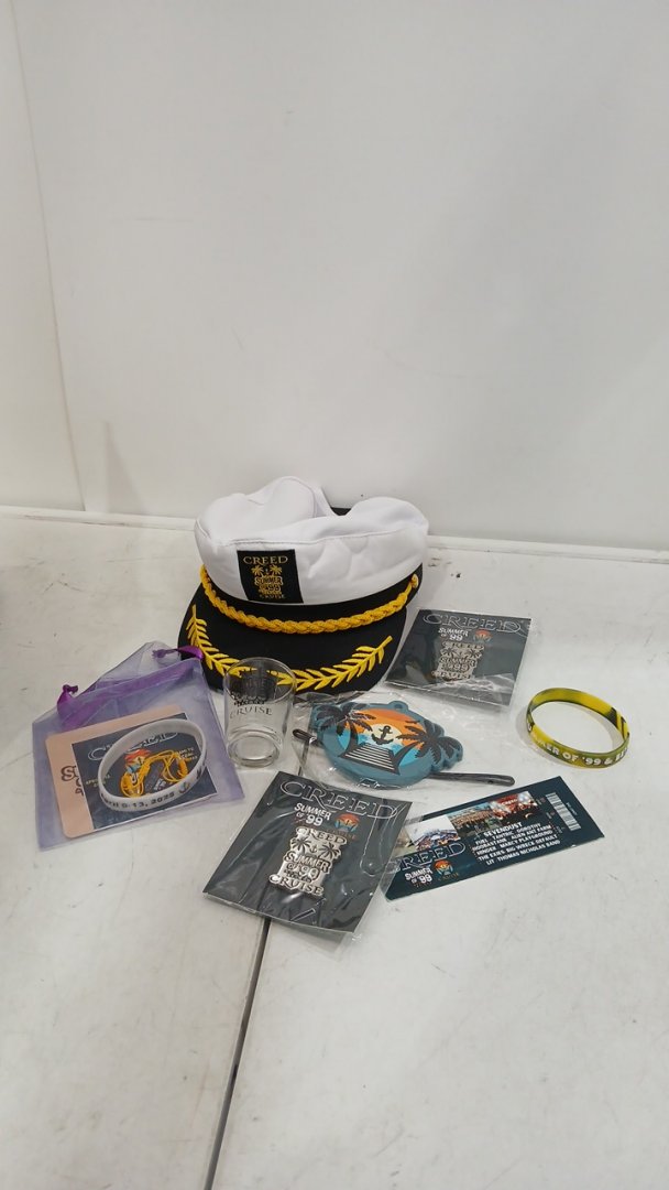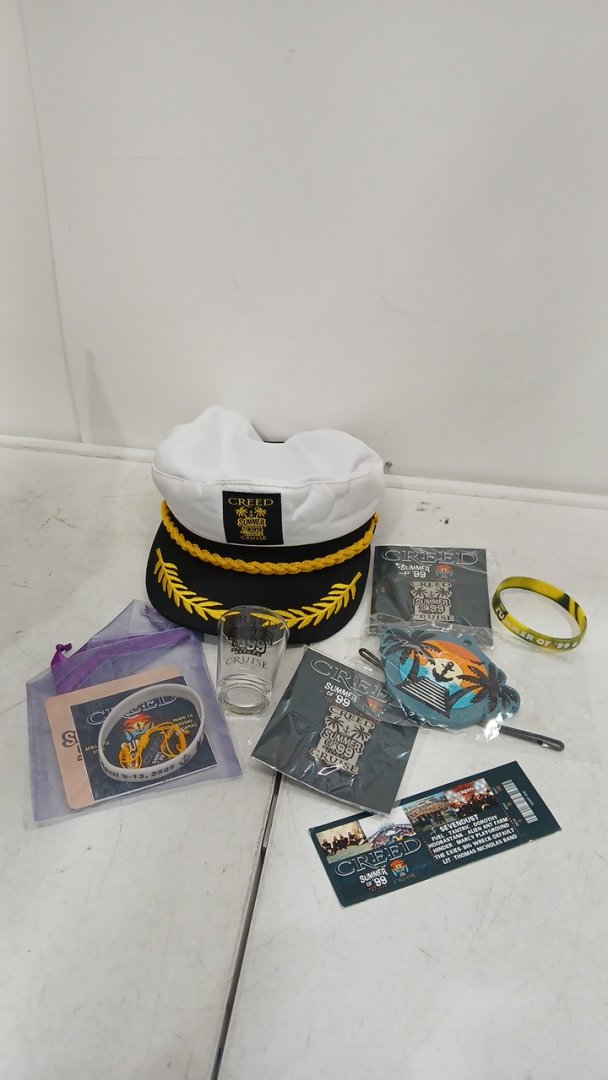 6+ ASSORTED CREED SUMMER OF '99 AND BEYOND CRUISE MEMORABILIA - CAPTAINS HAT, SHOT GLASS AND MORE