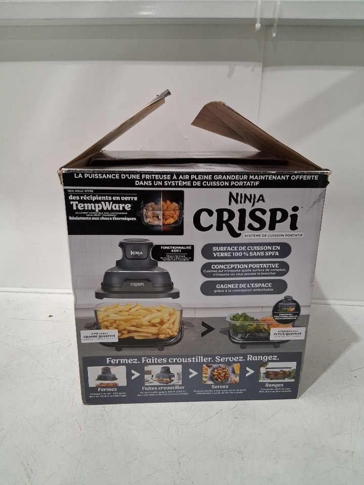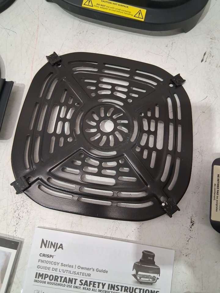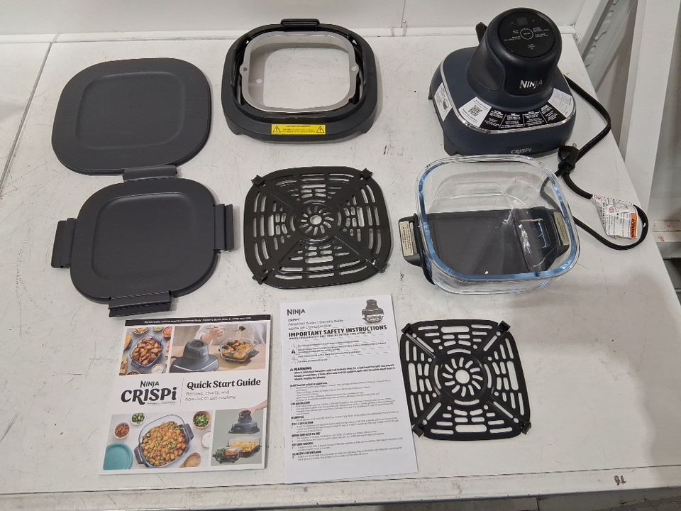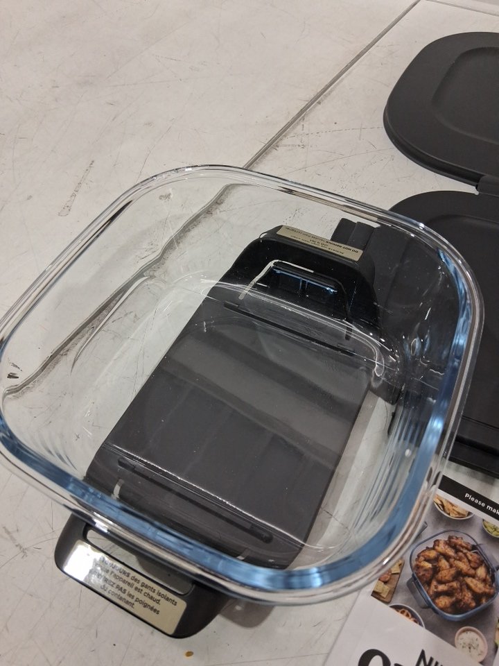 missing 4qt container, crisper plate is dented container adapter is dented and has damaged clip from one side, tested for power only