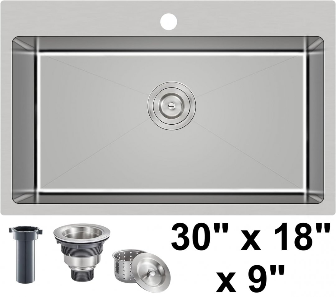 Menatt Stainless Steel Single Bowl Topmount Drop In Kitchen Sink - 30" x 18" x 9" - Steel (Model: CA-MTT3018U)