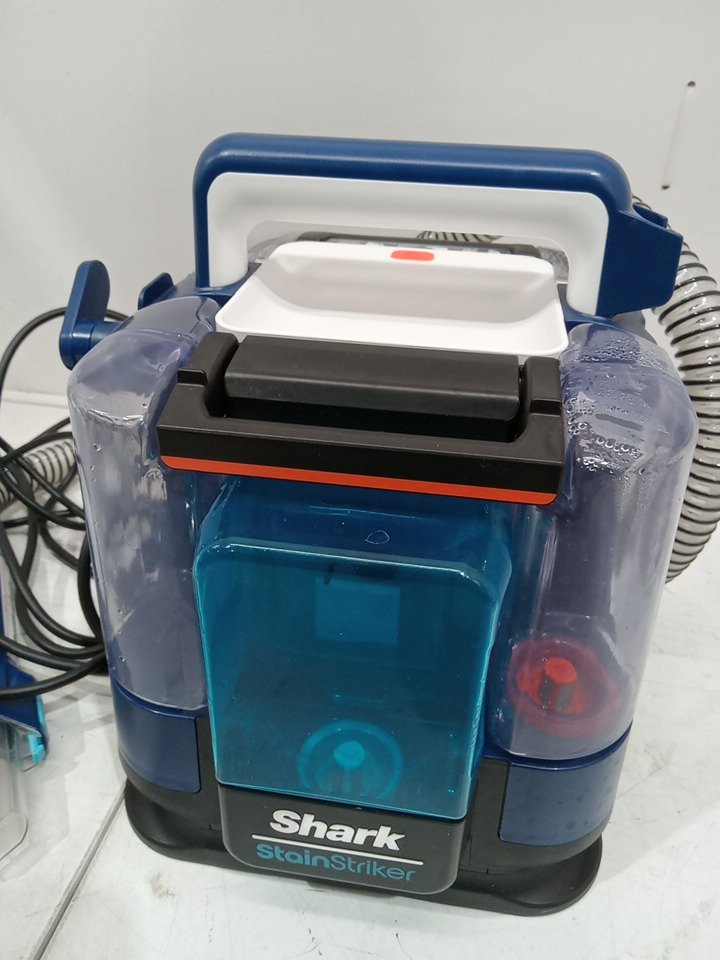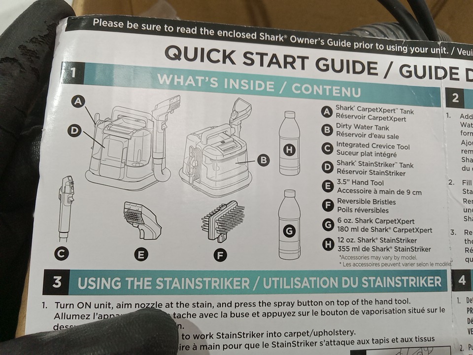 Please note that shark carpetxpert, reversible bristles and 3.5" hand tool are missing from the original packaging. There are water stains on the water tank due to previous use. Tested for power and motor function only. (Please see photos)