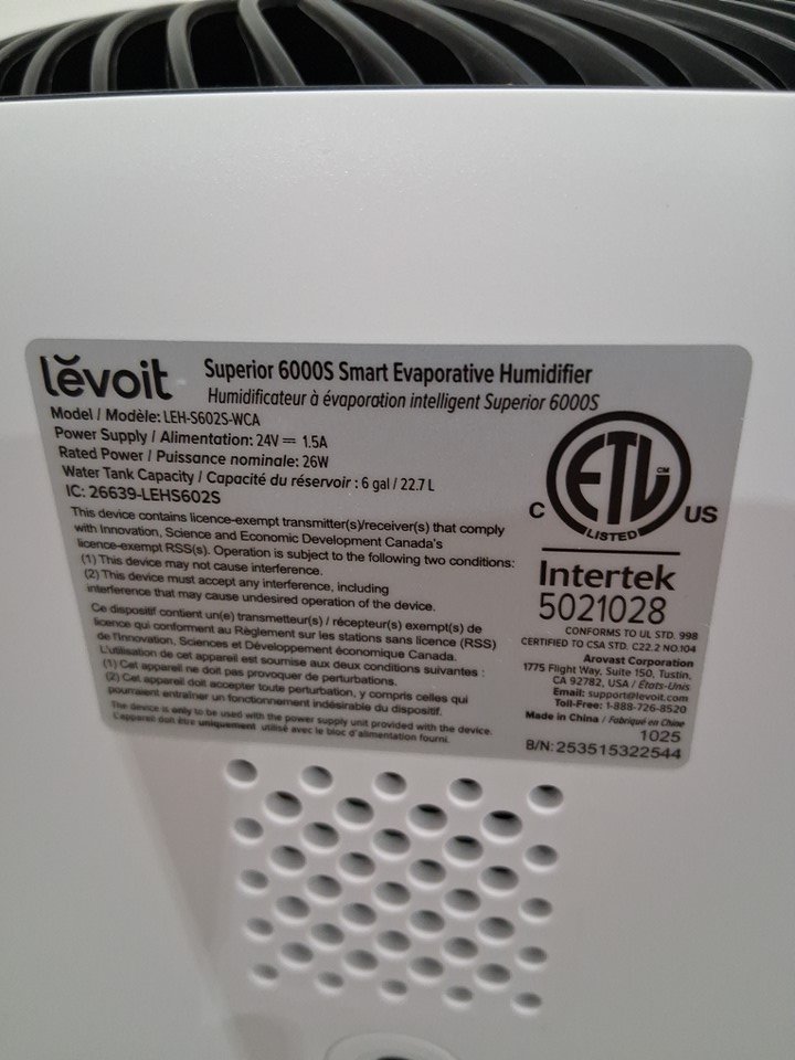 levoit evaporative humidifier superior6000s - 14.37" x 14.37" x 22.24" - white (model: leh-s602s-wca)
