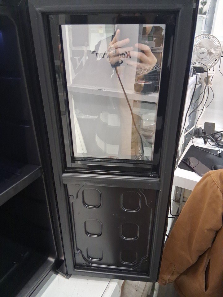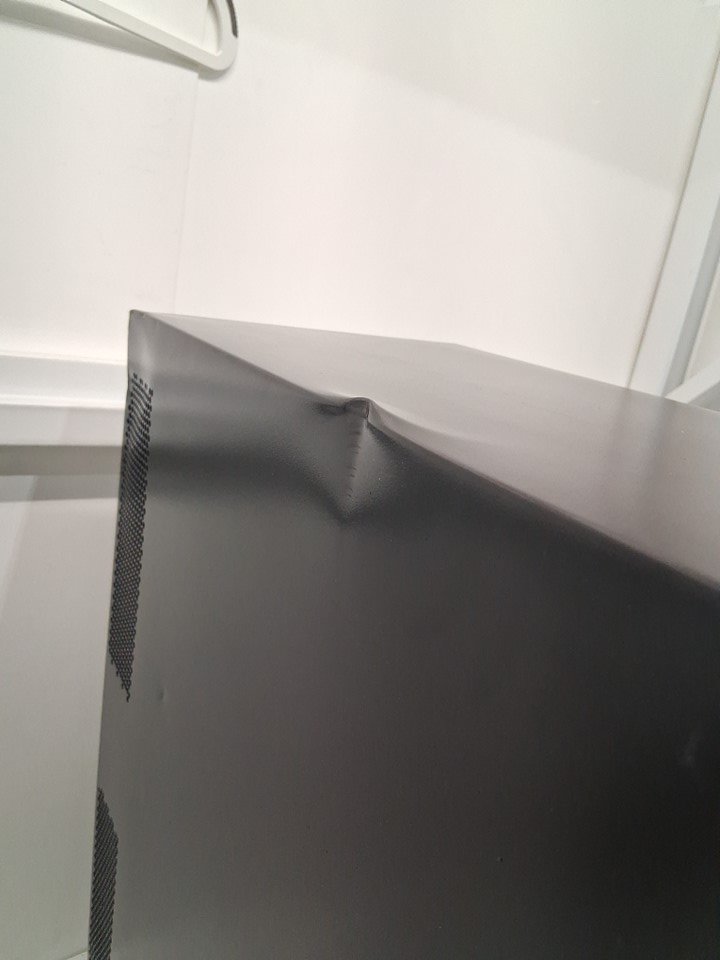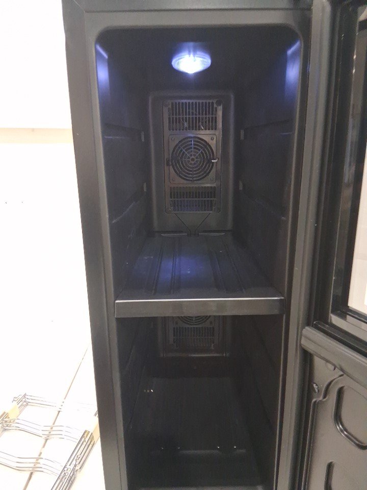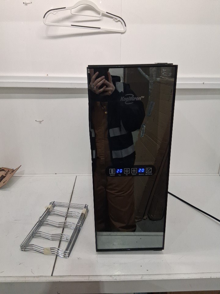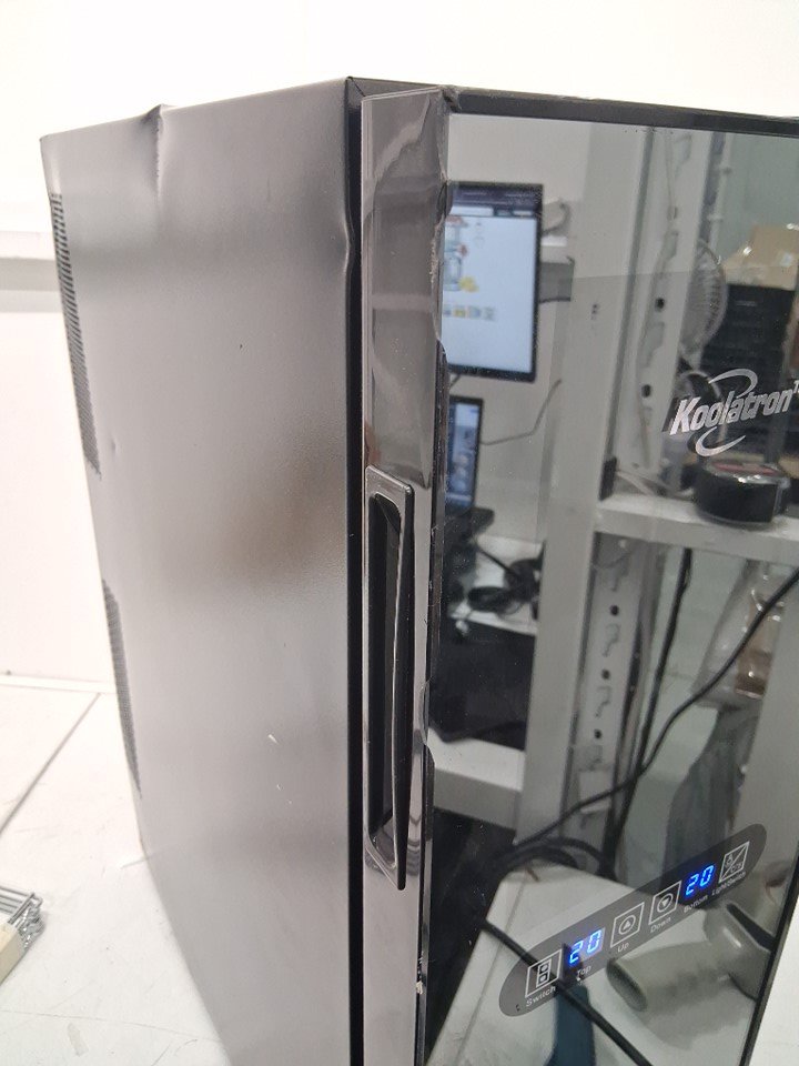 Wine cooler has light scuffing on inside, outside left side has two dents in casing, door edge by handle is chipped and top of door part of mirror casing is broken