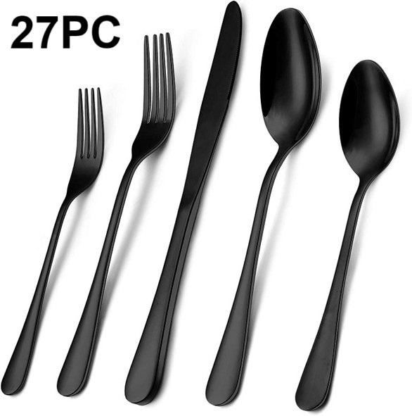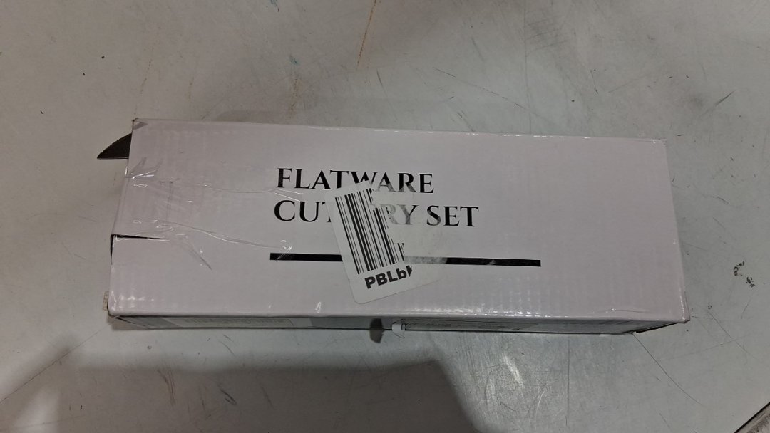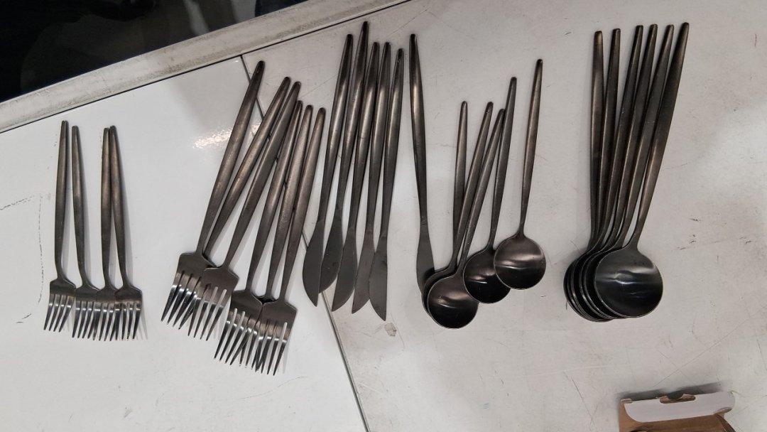 6 table spoons, 6 large forks, 6 butterknives, 5 teaspoons, 4 small forks, there are small scratches on the cutlery. likely from shipping