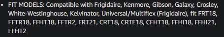 FITS VARIOUS FRIGIDAIRE, KENMORE, GIBSON, GALAXY, CROSLEY, WESTINGHOUSE, KELVINATOR MODELS