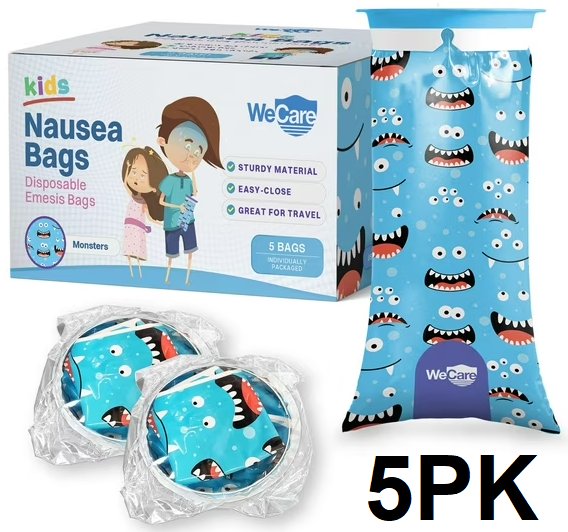 5pk wecare kids disposable leakproof waste nausea vomit bags - blue monsters