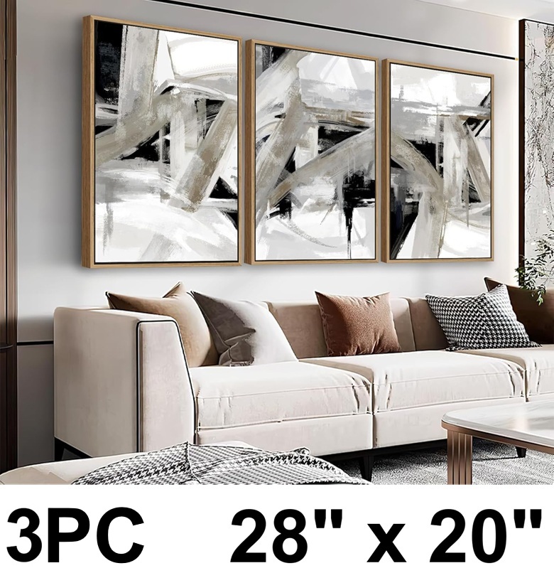 3pc NINEASO Bold Abstract wood framed Modern canvas painting - 28" x 20" - Taupe Black Gray Abstract Artwork