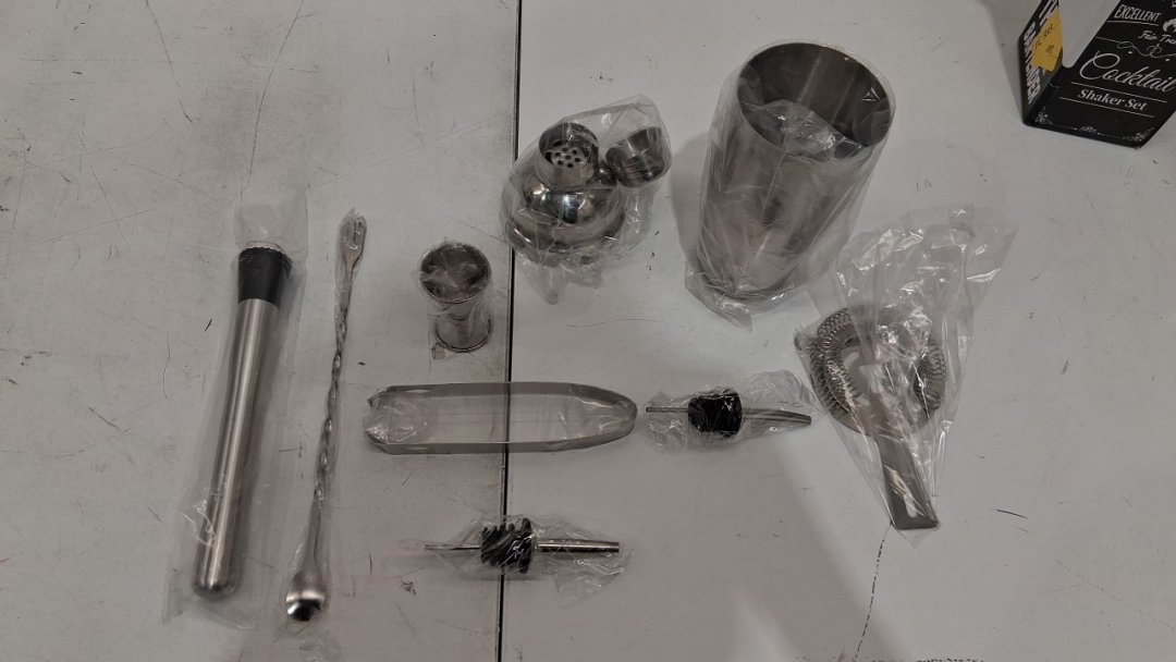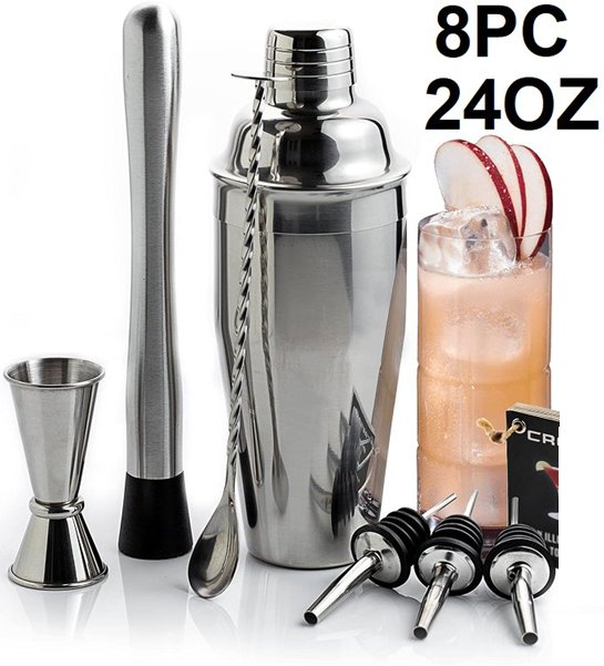 8pc Unbranded Cocktail Shaker Set with Premium Drink Mixer Accessories: Drink Shaker with Strainer, Jigger, Twisted Bar Spoon, tongs, Liquor Pourers - 24oz