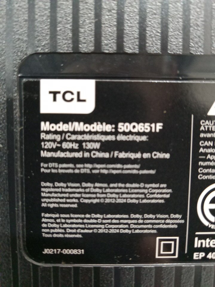 Item tested and working. There is a white spot on the right side of the screen. Customer will need hardware to install the plastic tv feet. See attached photos.