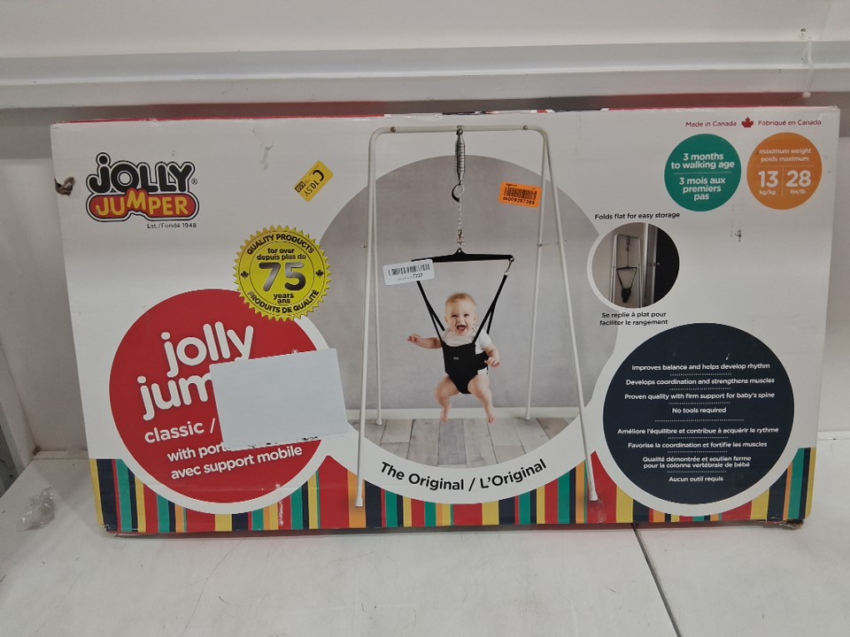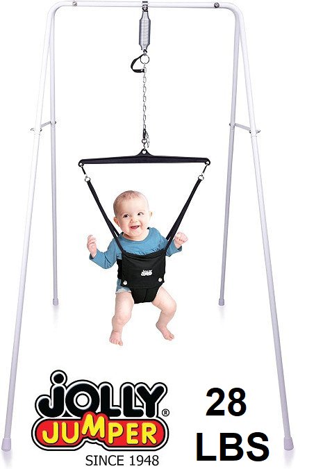 Jolly Jumper Classic Portable Baby Exerciser With Grey Fabric Saddle - 28 LBS Max - White/black (Model: 108)