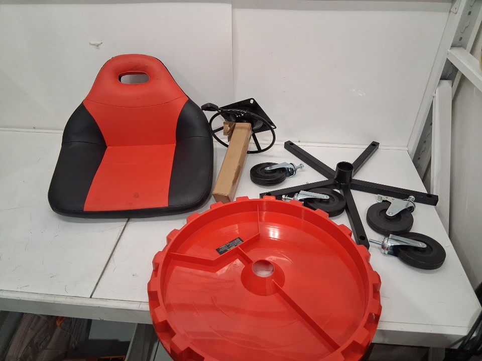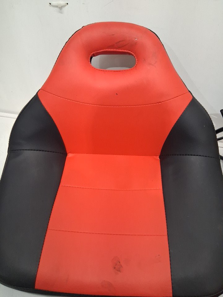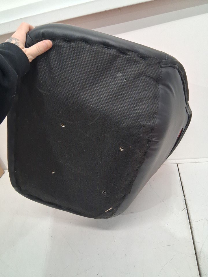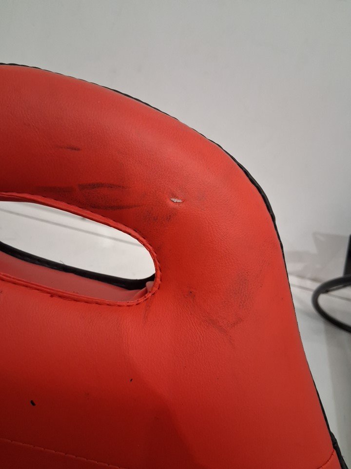 stool has black grease stains on it, and there is small hole on stool near handle, hardware for stool attaching to hydraulic base is missing