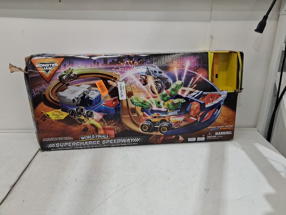 kids Monster Jam Supercharge Speedway Light Up World Finals Track Playset with Megalodon and El Toro Loco Die-Cast Monster Trucks