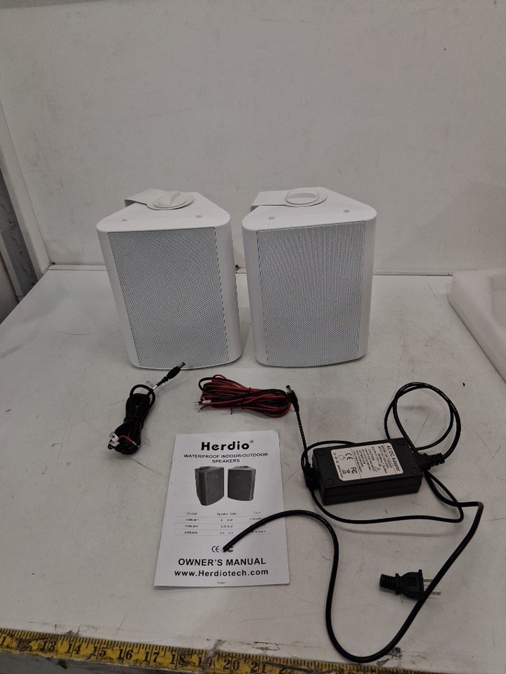 one of the speakers has some minor marks possibly due to shipping , also the power cord is broken off
