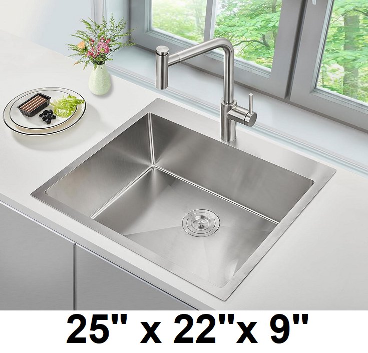 single bowl drop in top mount kitchen sink - 25" x 22" x 9" - stainless steel - (model:‎TBM802522U923)