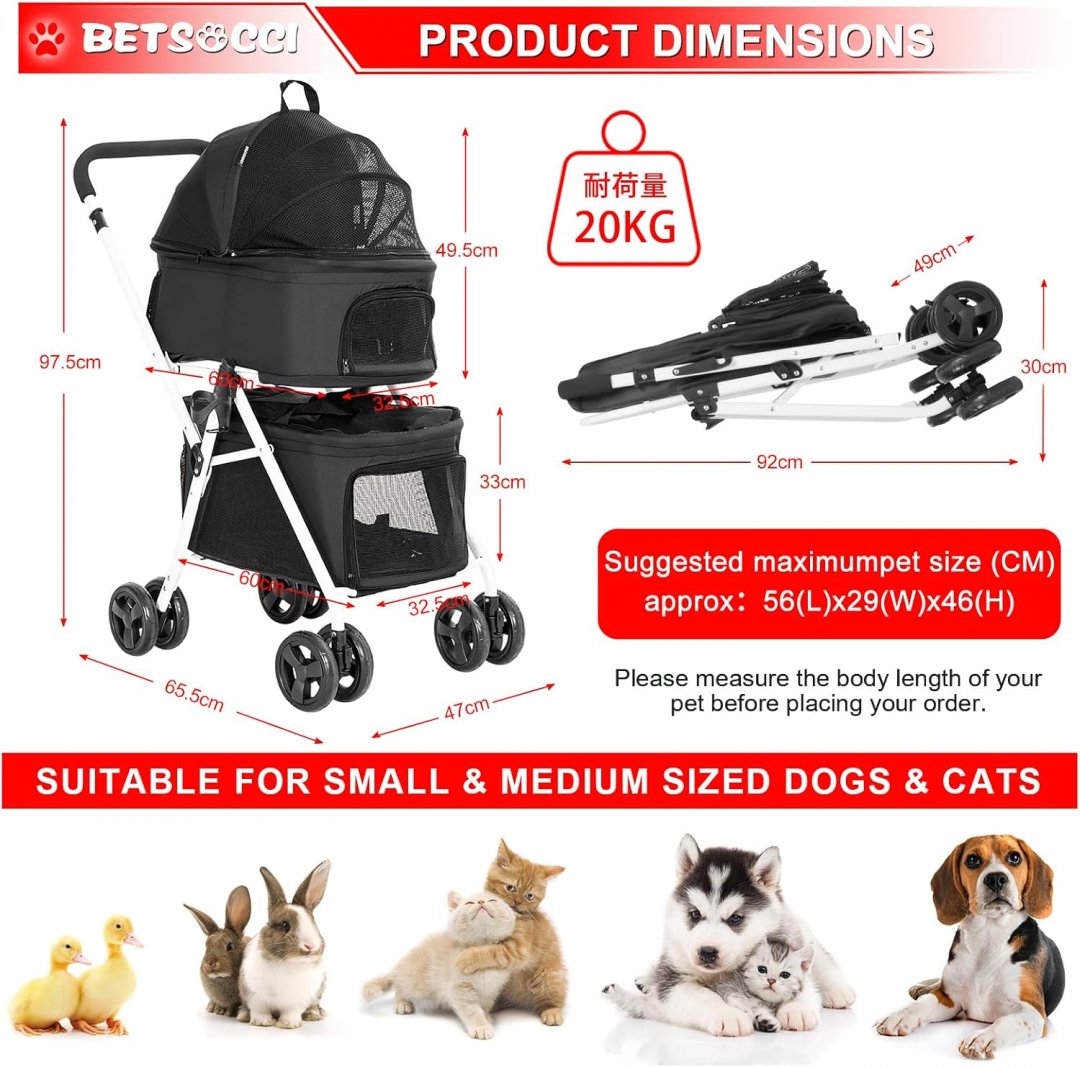 BETSOCci 3-in-1 Pet Stroller with Detachable Carrier - for Medium Small Dogs/Cats - black (model: r218)