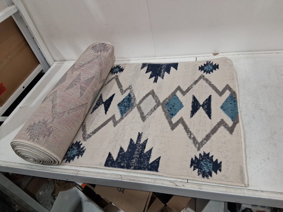 BOHO GEOMETRIC INDOOR HALLWAY RUNNER CARPET - 2FT X 16.5FT - WHITE/BLUE