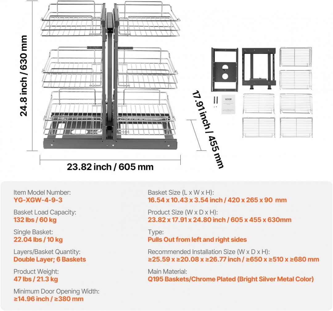 BLIND CORNER PULL OUT BASKET 3 Tier 6 Shelf Kitchen Cabinet Organizer - 24.8" x 23.8" - 132LBS Cap (Model: YG-XGW-4-9-2)