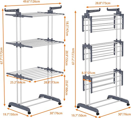 HOMIDEC 4-tier Adjustable & foldable Stainless Steel Clothes Drying Rack - 68" x 20" x 30" - Grey