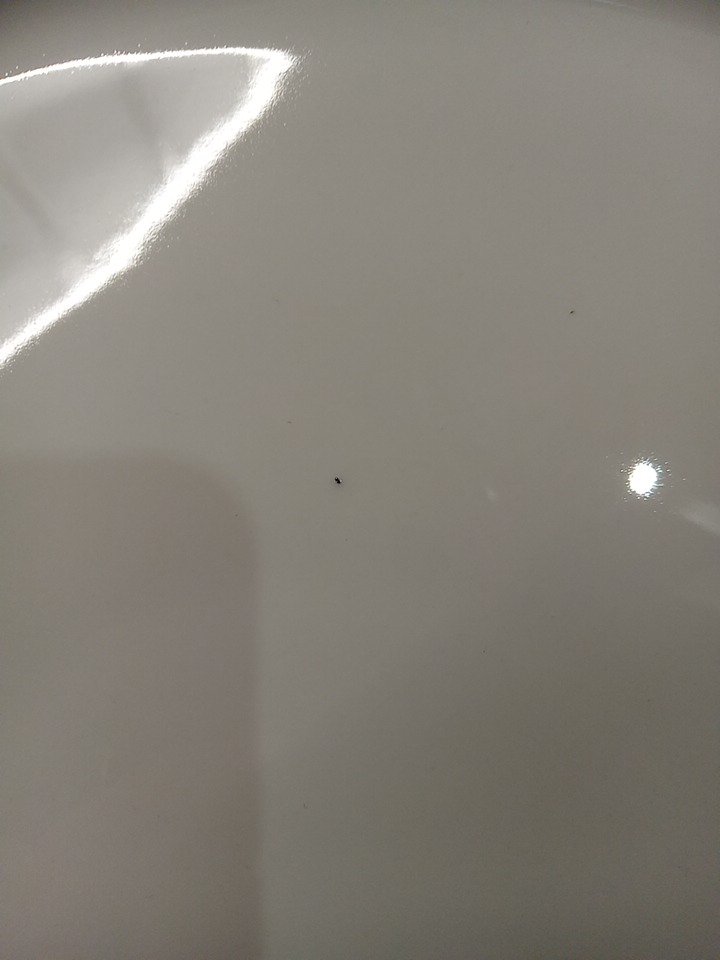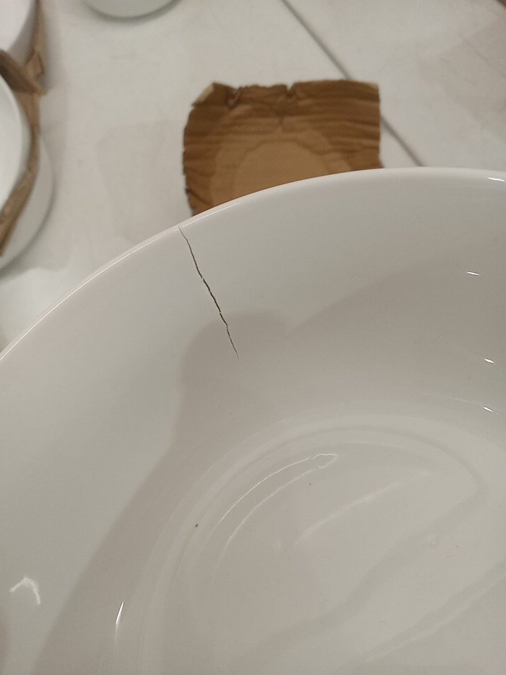 Two manufacture defects present. One is in the larger plate, it is a small black mark in the porcelain. The other is a crack in one of the smaller bowls, likely hap opened during the firing process in the kiln.