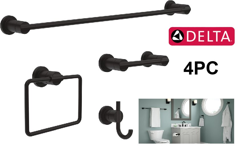 4PC Delta Nicoli Bathroom Set 18" Towel Rack, Toilet Paper Holder, Hand Towel Holder, Towel Hook| Bathroom Accessory Set - Matte Black (MODEL:NIC64-MB)
