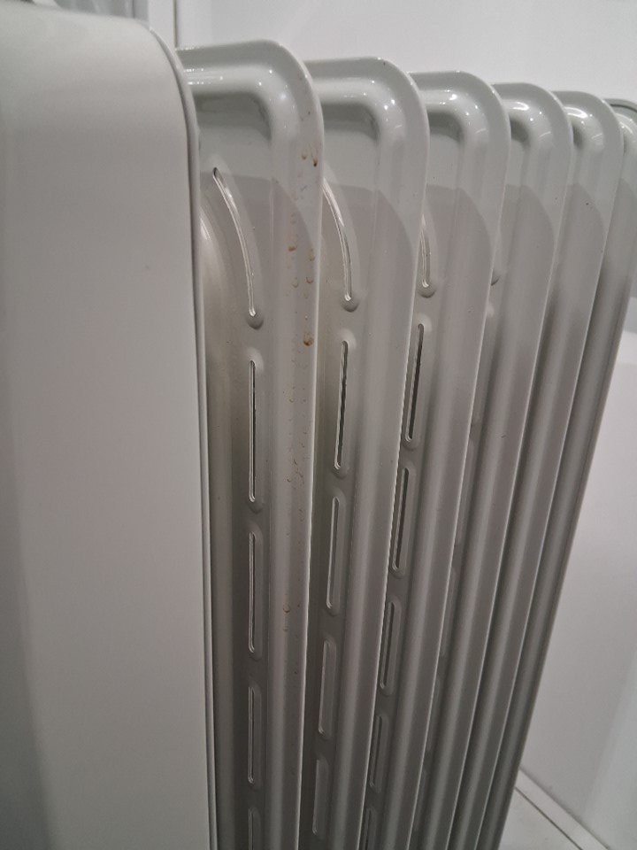 Heater has visible splatter stains on it and visible dust. Has been tested for power