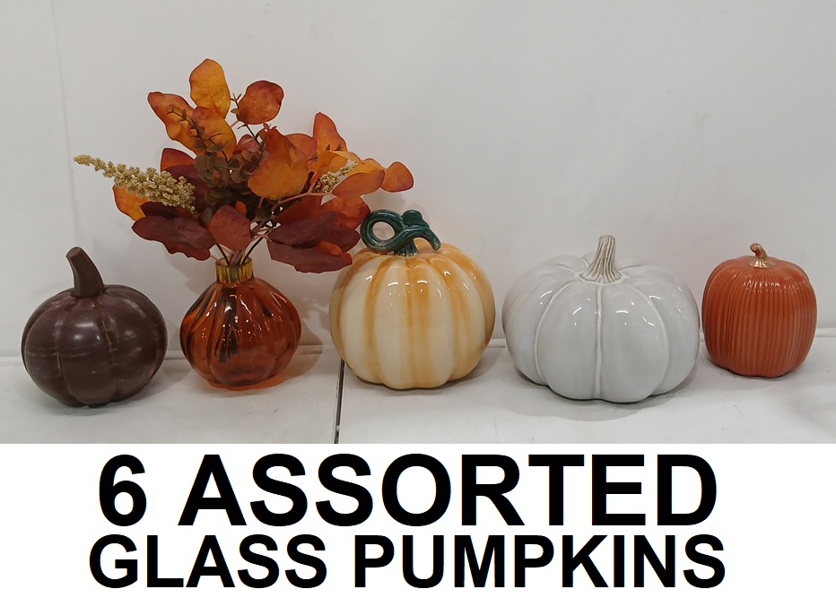 6 ASSORTED GLASS PUMPKINS FOR FALL HOME DECOR - ASSORTED SIZES AND COLORS