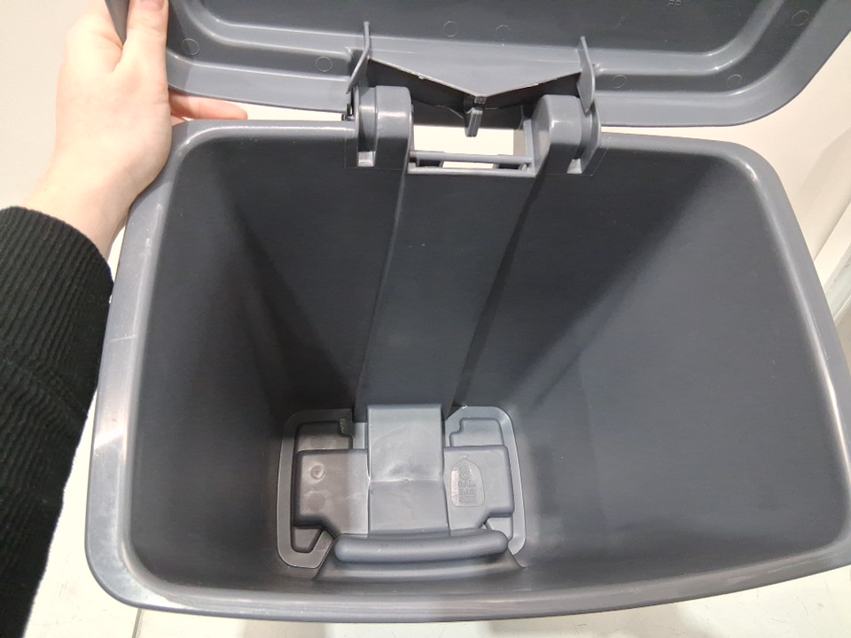 item has scuff marks on the outside front and plastic is a bit warped on left piece holding lid on, doesn't affect function. (see photos )