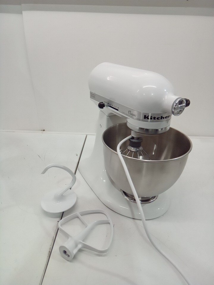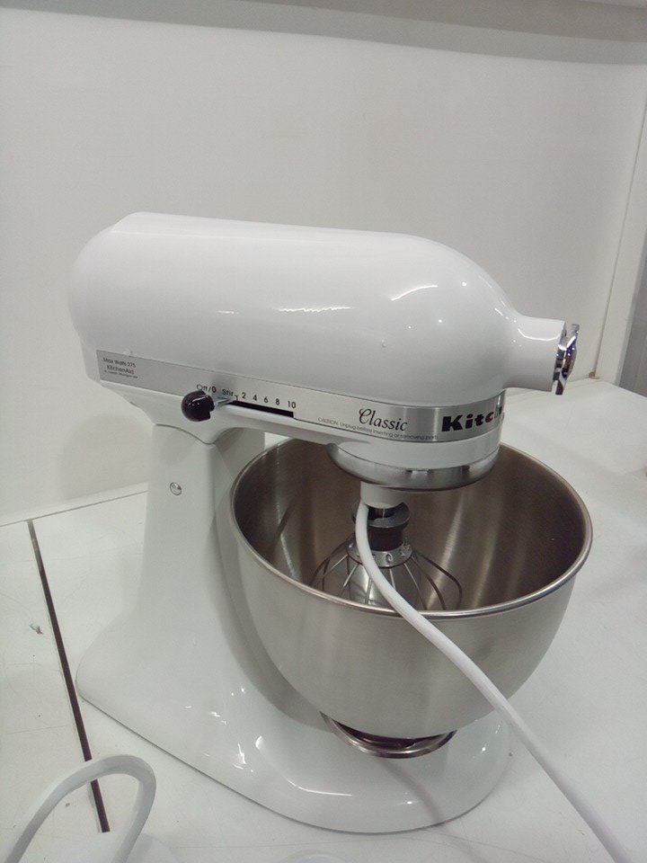 please note that there is slight staining in the bowl from previous use, and the whisk is dented. see photos. tested for basic power.