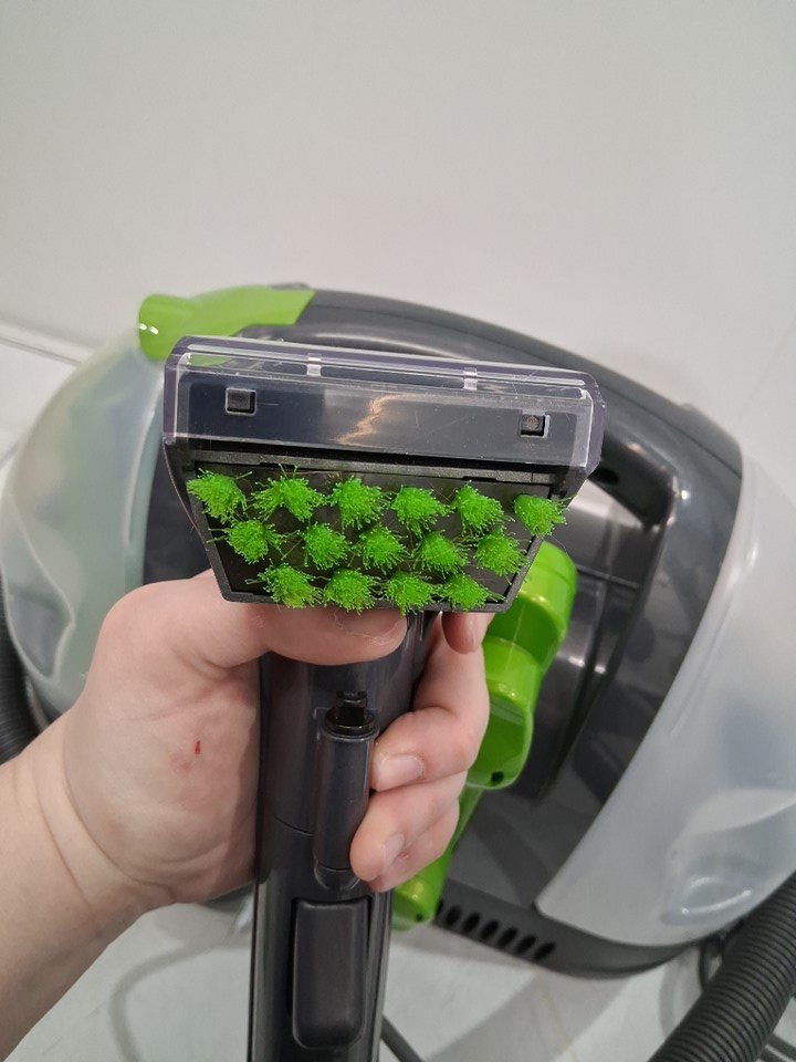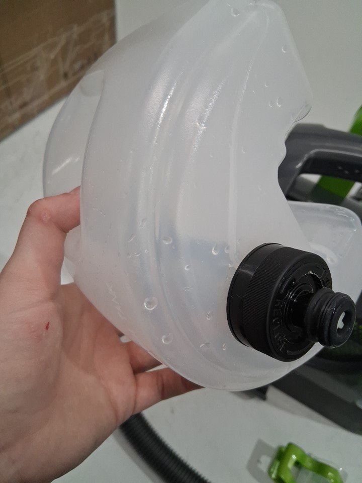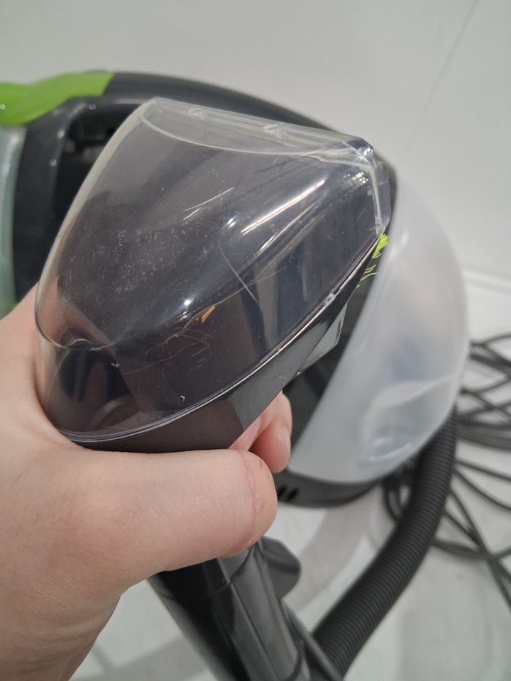 Product has some light water inside machine and is missing the cleaner bottle. Also has a small bit of debris inside of accessory brush head (See photos)