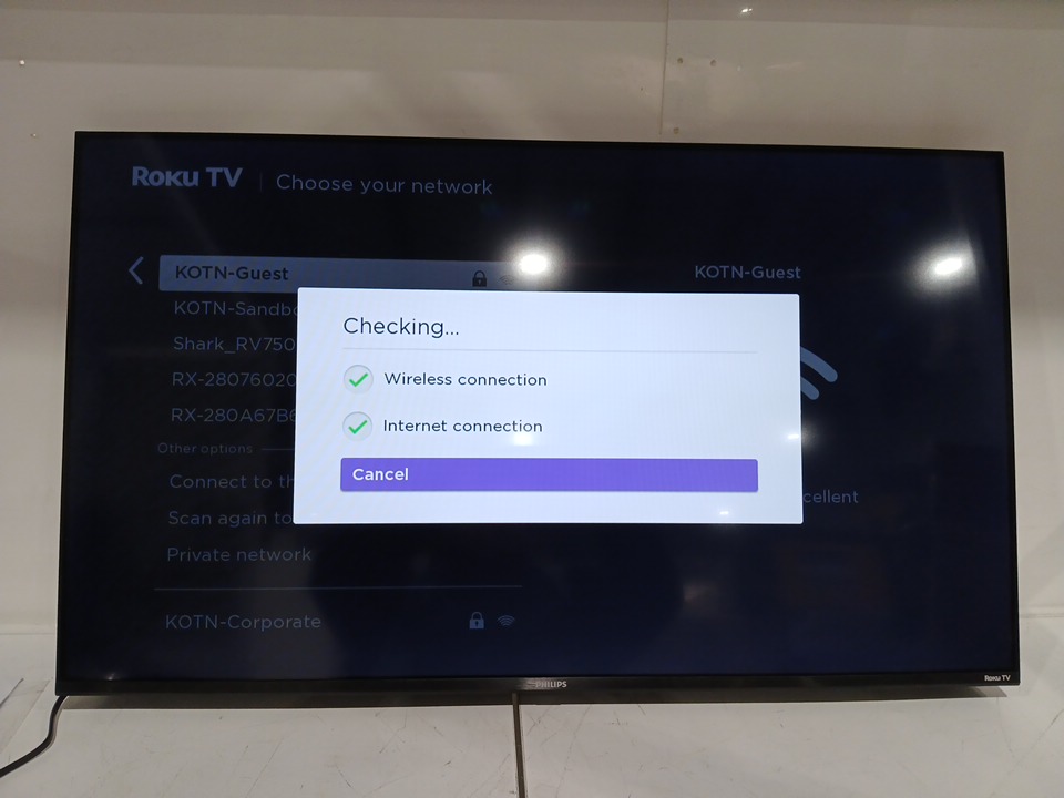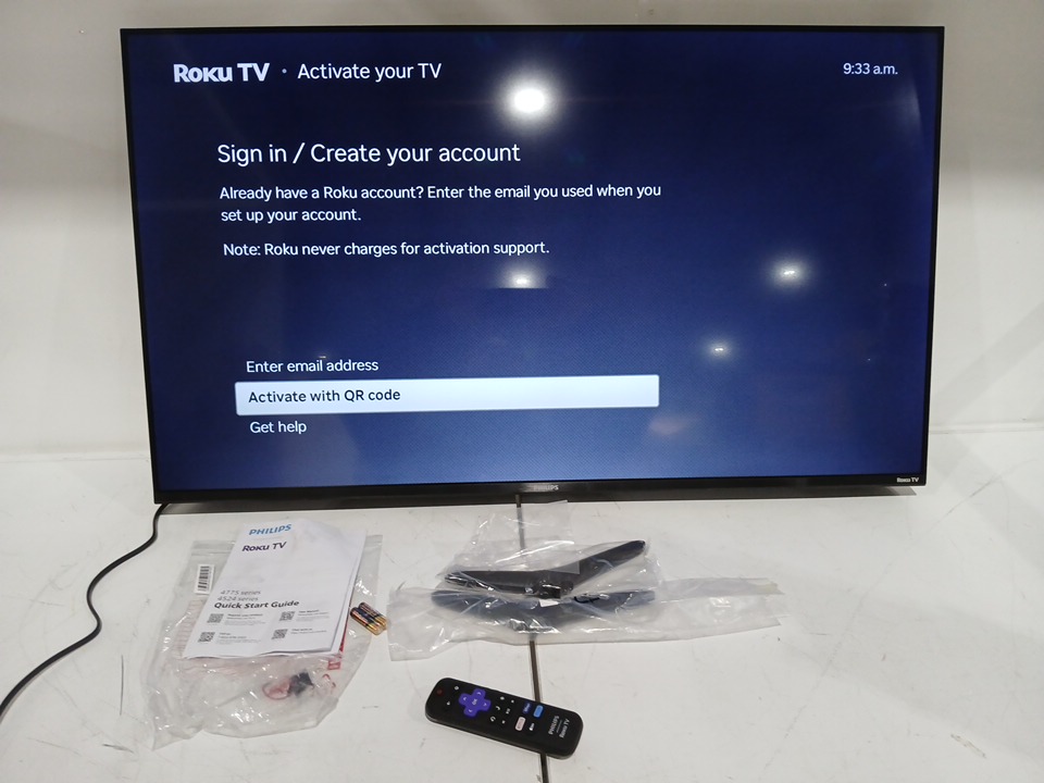 the tv has been tested for power & internet connectivity but cannot test for pixel and user use as a roku account is needed to advance to features.