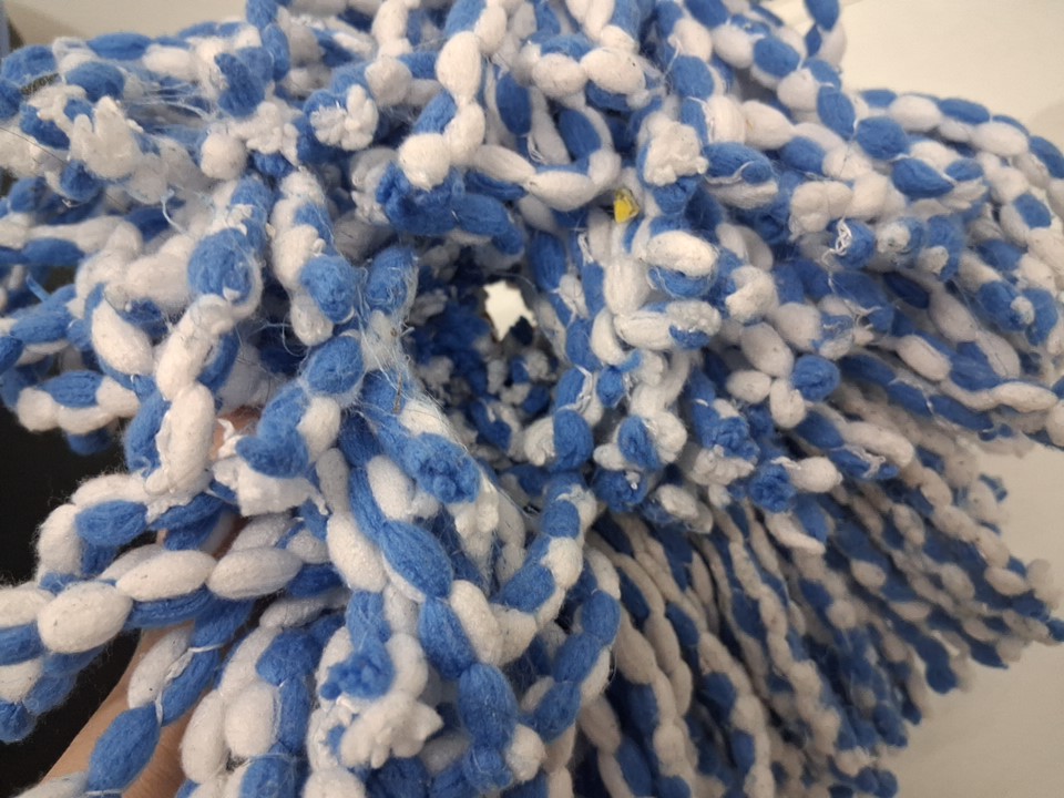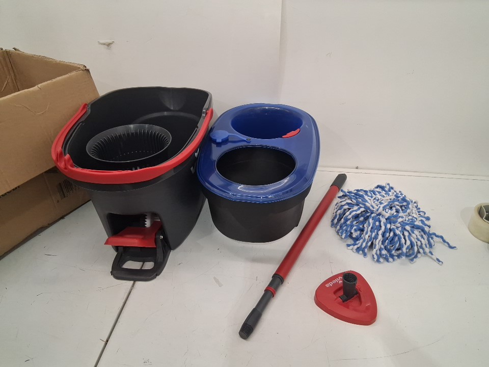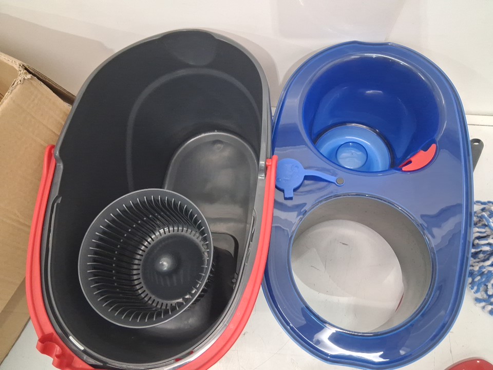 Mop bucket has visible water spots and mop head has dirt discoloration and some debris in it