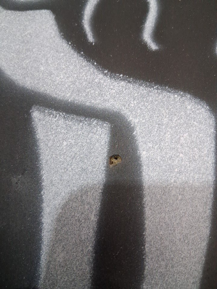 Has a single small hole in it from use, overall there are some light scratches and chips, these may also be from use or shipping