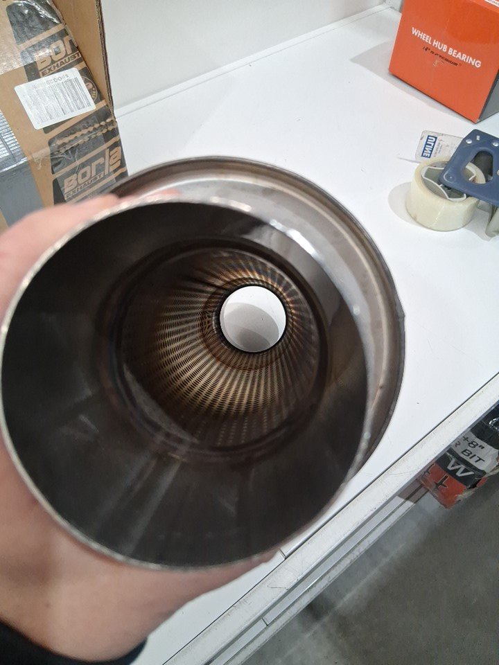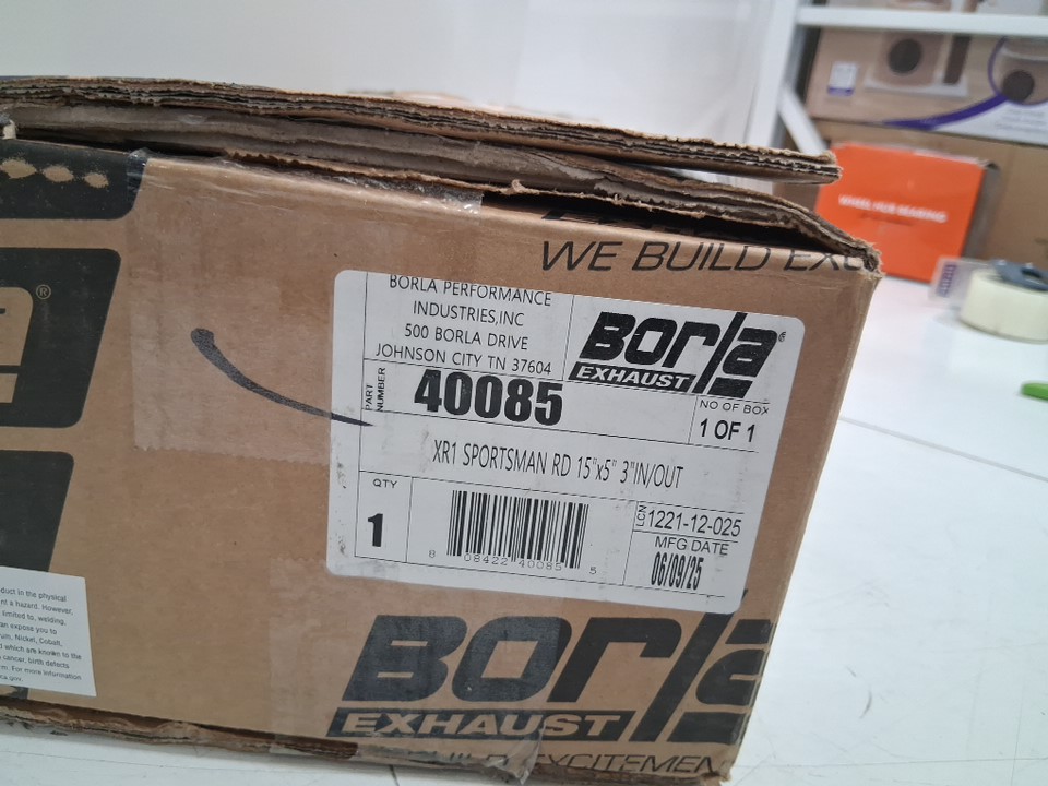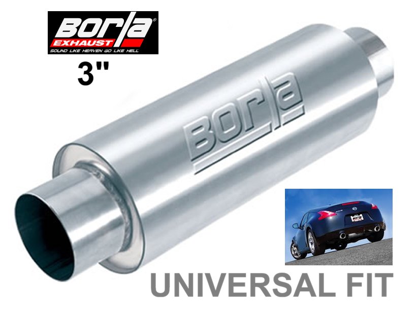borla exhaust xr-1 sportsman racing muffler- 3" center inlet, 3" center outlet, 5"D x 15"L (20" overall)- universal reversable fit- silver (model: 40085)