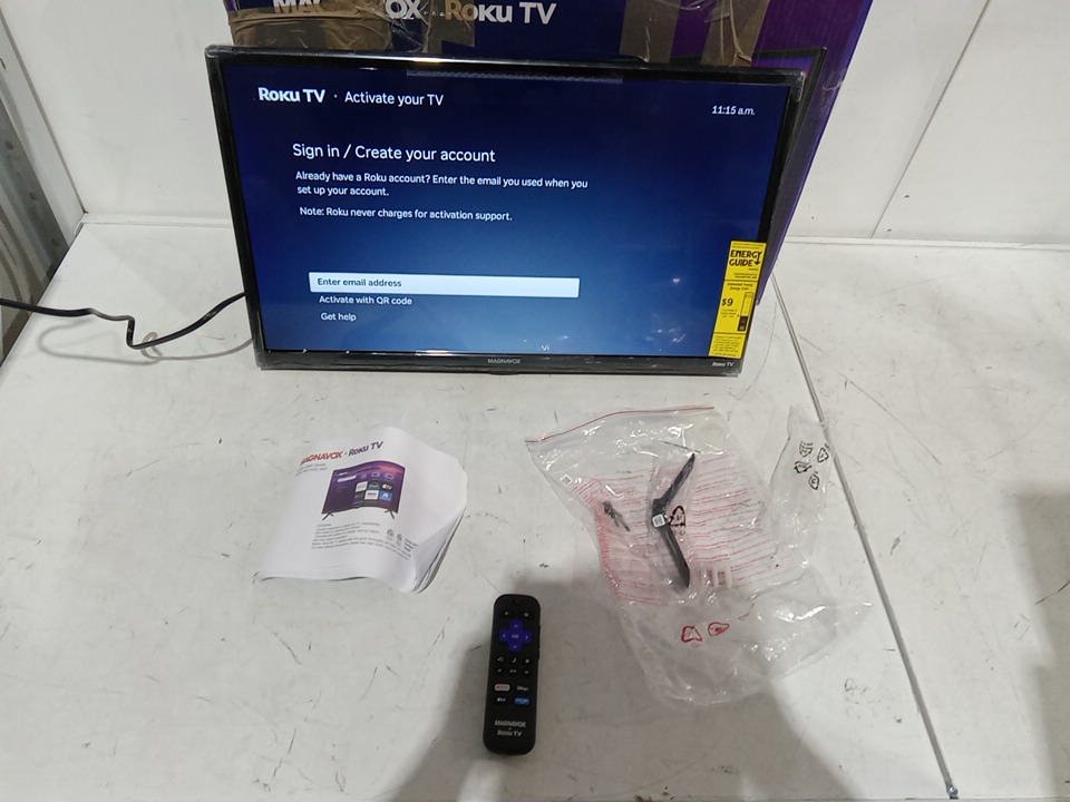 one of the stands is missing, their is a crack on the back side of the tv from shipping and handling or prior light use, this is a cosmetic issue but should not effect the usage, upon testing we found that a email is required in order to activate meaning we could not test this tv past this screen. see photos below.