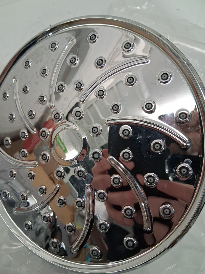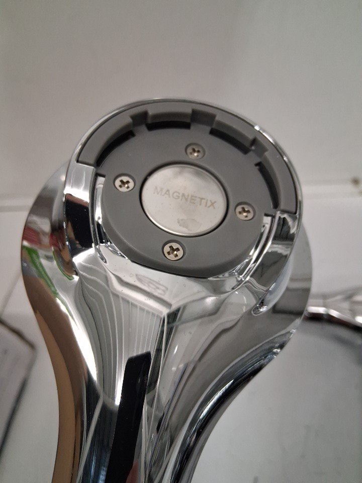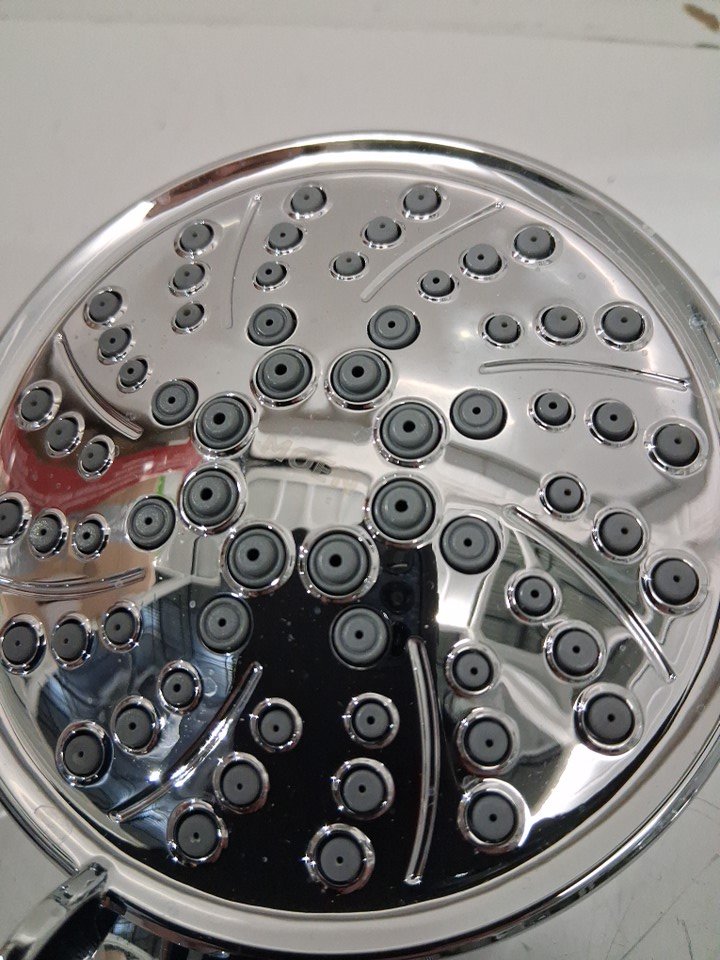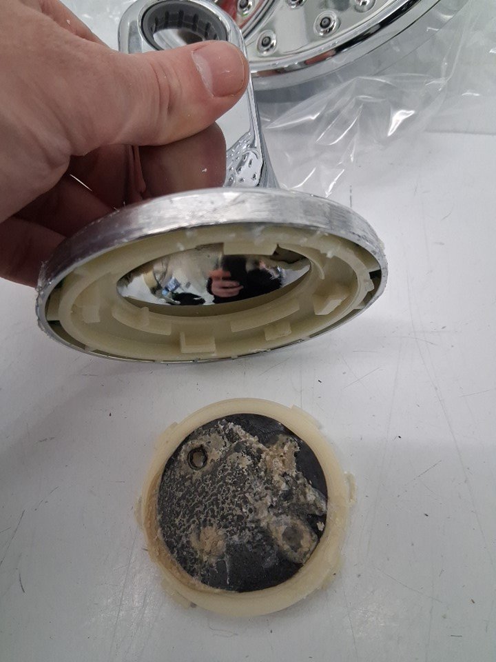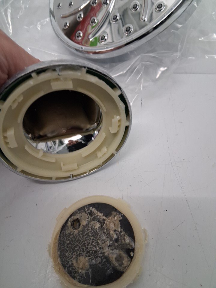 Water marks on heads from prior use- There is some caulking/adhesive on the back of the holder, could be scraped off- (see photos)