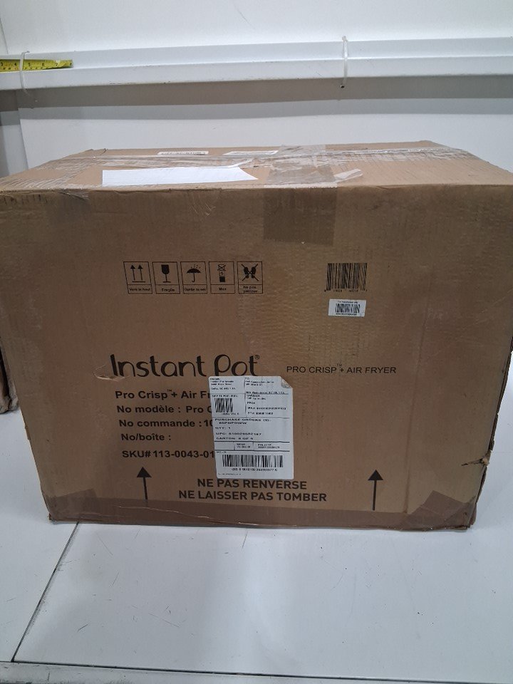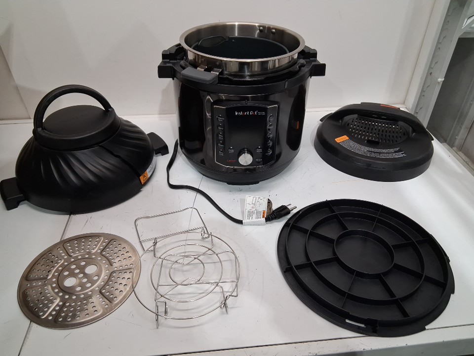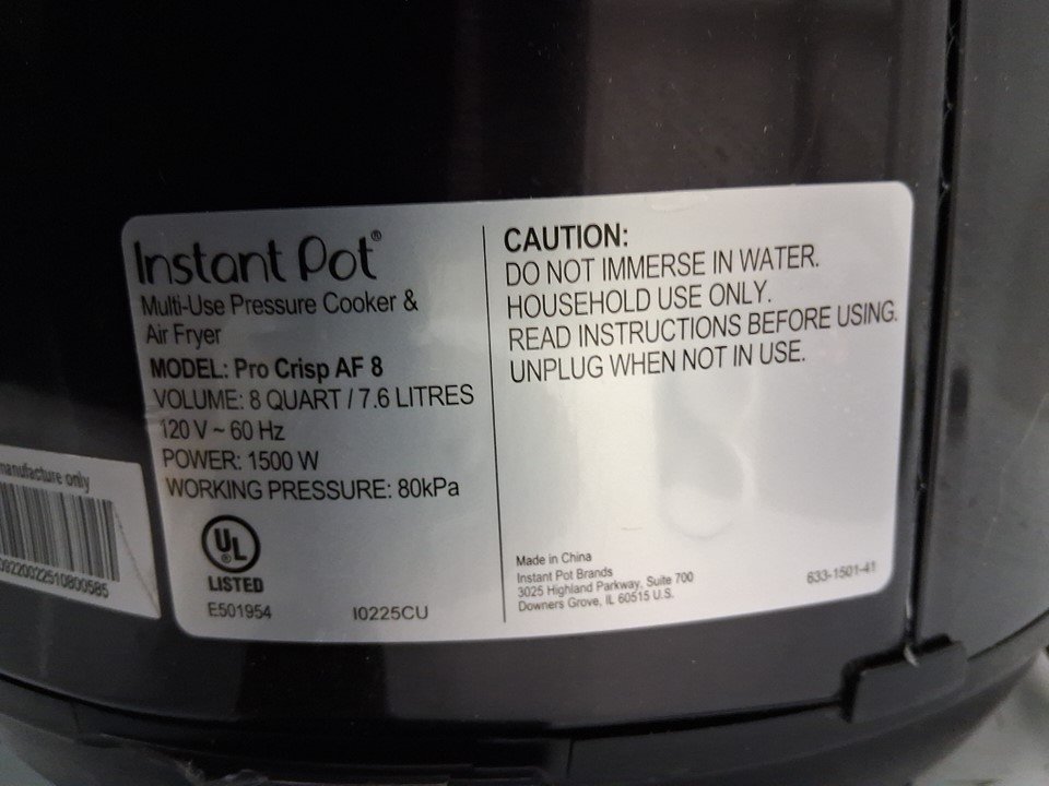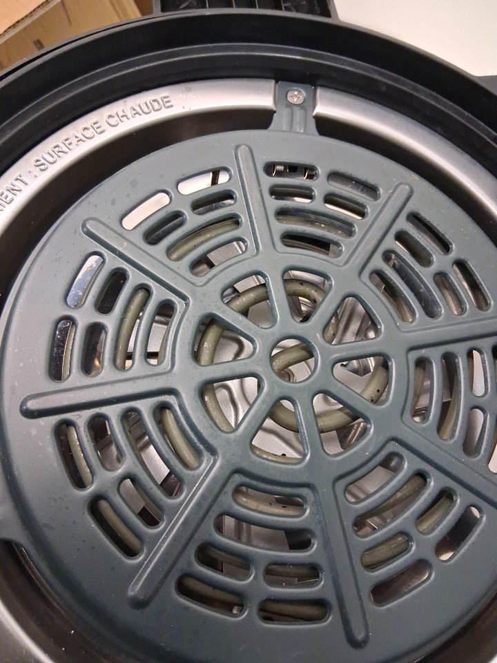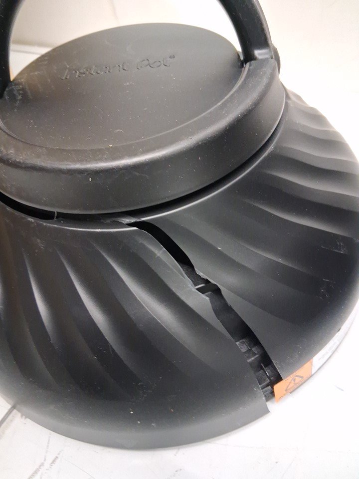 The air fryer lid plastic cover is cracked- unsure if this will effect function- The pot has some marks inside from prior use (see photos) Tested for basic power