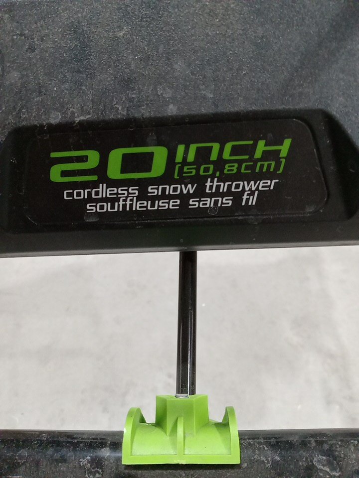 Item shows signs of light use. Unable to test item (no battery present to test). Item marked with having issue as it is missing the handle end that is used to change the direction of the chute. See attached photos.