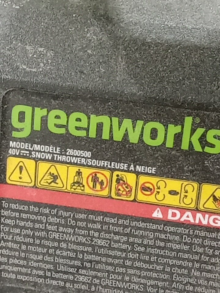 Greenworks 40V 20" Brushless Snow Thrower, Battery And Charger Not Included - GREEN (MODEL: 2600500) *TOOL ONLY*