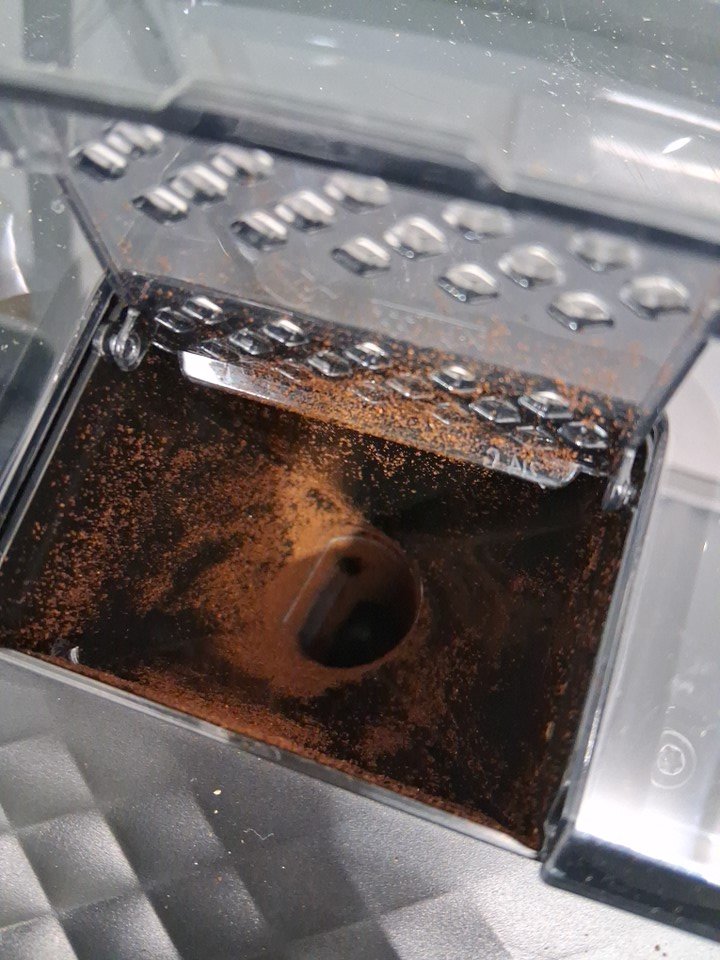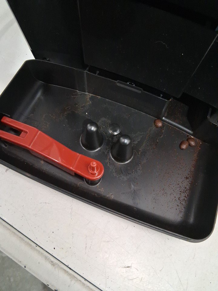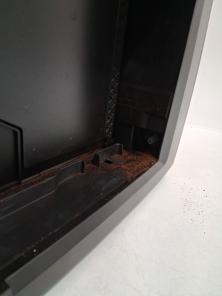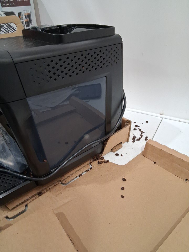 Plenty of coffee beans were in box on open. clear use of item, did basic cleaning during inspection. Basic power test, unable to check function due to the nature of the item. Should be able to clean up the last spots with minimal to no stains.