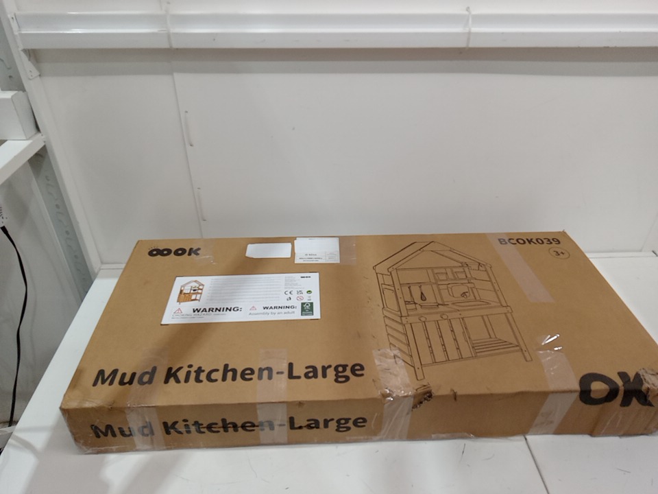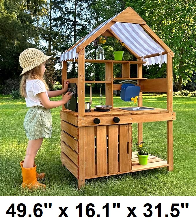 oook mud kitchen playset with canopy - 49.6" x 16.1" x 31.5" - fir wood - ages 3+ - brown (model: bcok039)