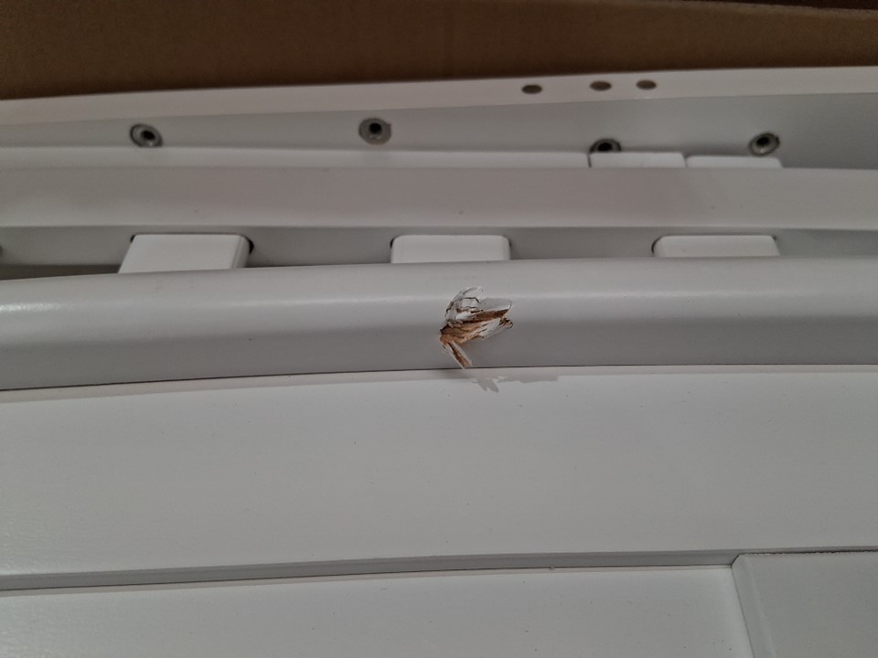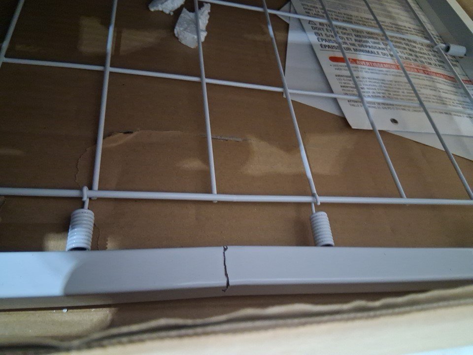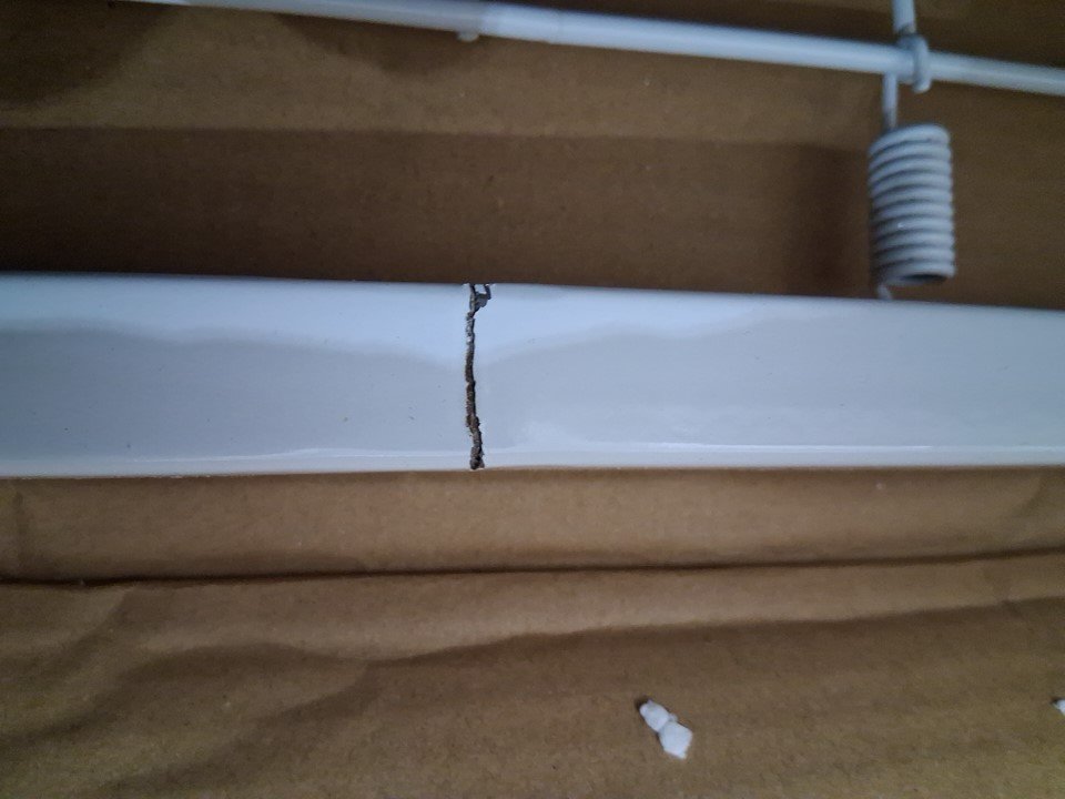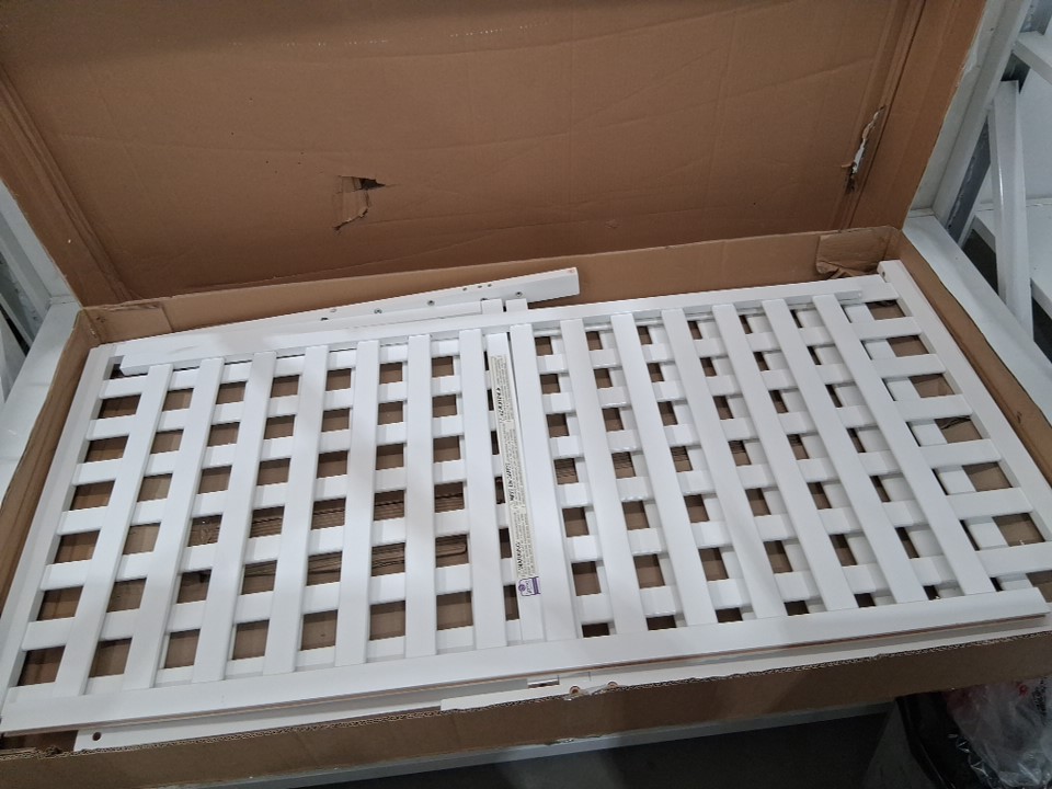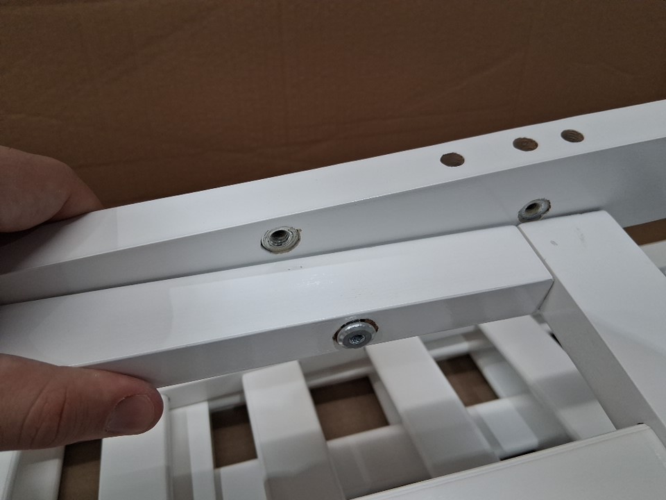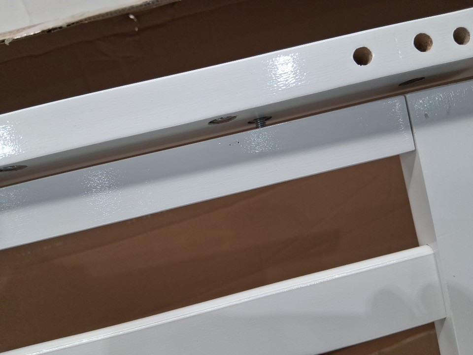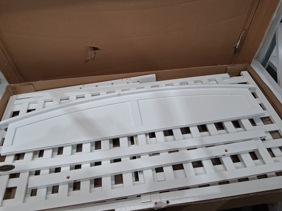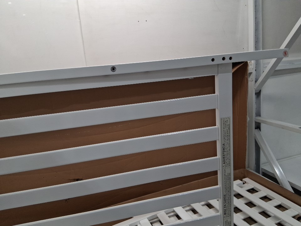The edge of the metal bedframe has a small crack in it which may lead to the part snapping if too much weight is placed on it. Customer is urged to repair or reinforce the frame in some way for the sake of structural stability and safety. Additionally, there is some chipping on the headboard and some of the wooden slats due to shipping, and one of the legs already being attached to a side wall plus some of the screw holes on the legs appearing slightly stressed indicates some previous handling and at least partial assembly. Some additional hardware (screws, etc) may also be required as some may have gone missing due to previous handling or shipping - please see photos. Other than the already mentioned issues, all parts appear to be present and in good condition with no major damage visible.