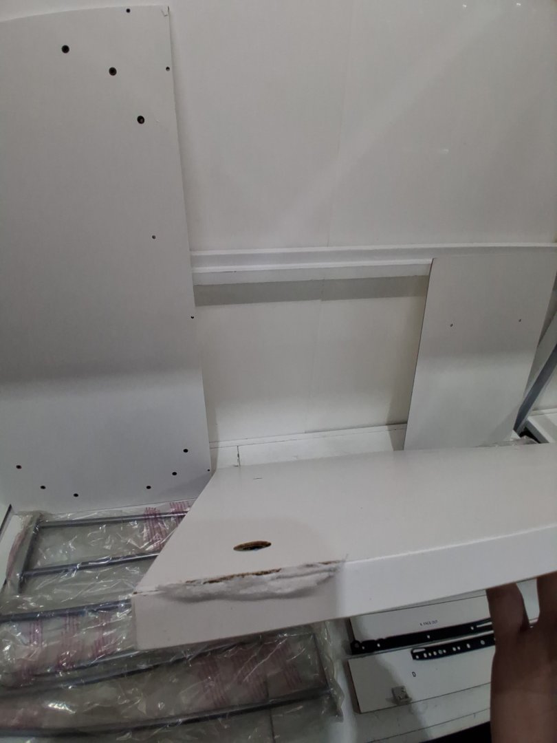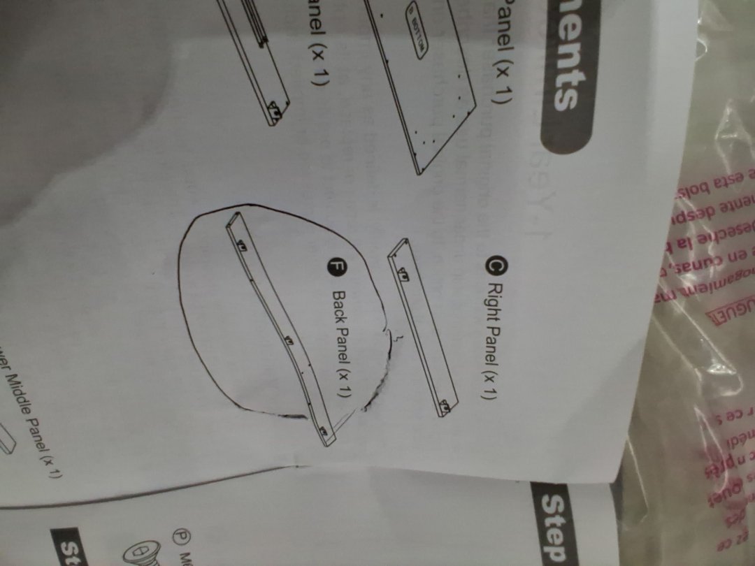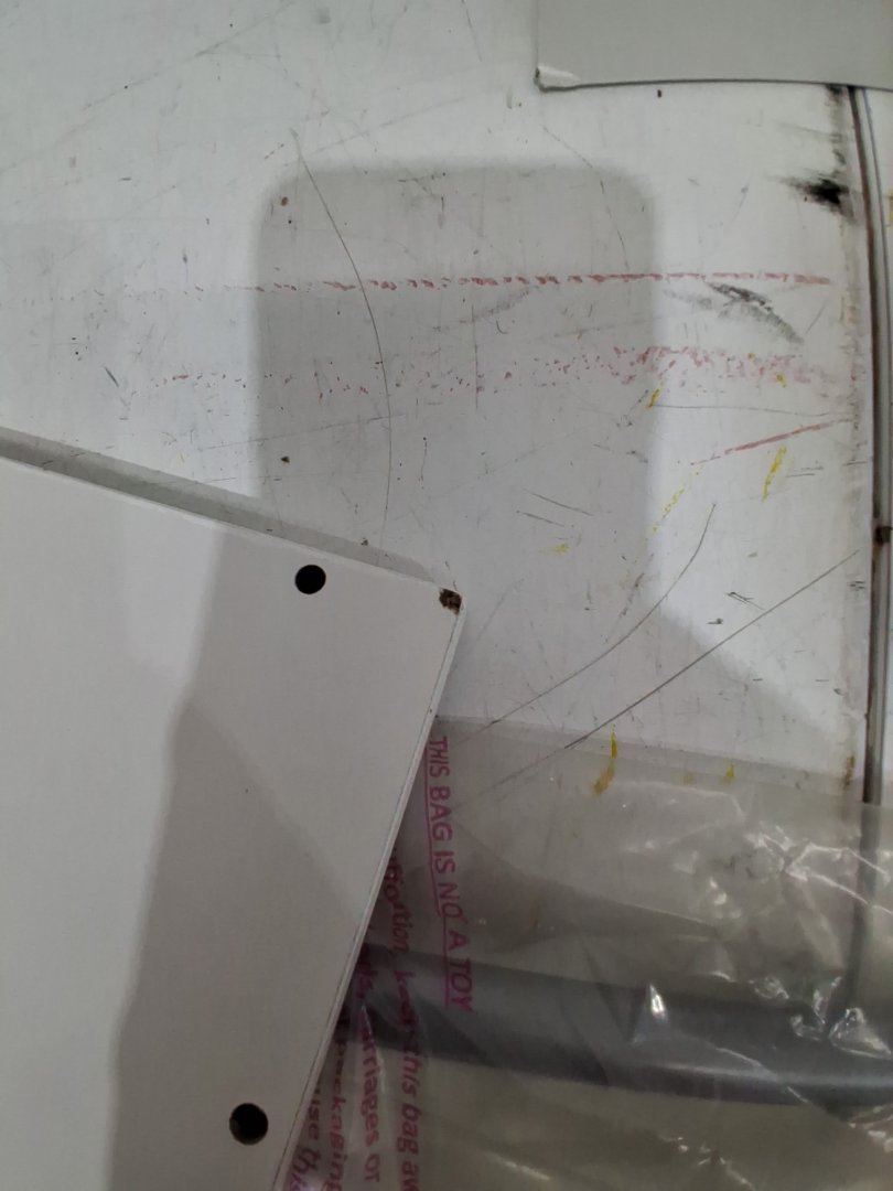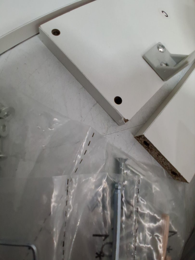 scratches/chips in the top and bottom pieces, as well as other smaller wood components. Missing the back piece. May be able to contact manufacture for replacement, manual is in the box with contact information