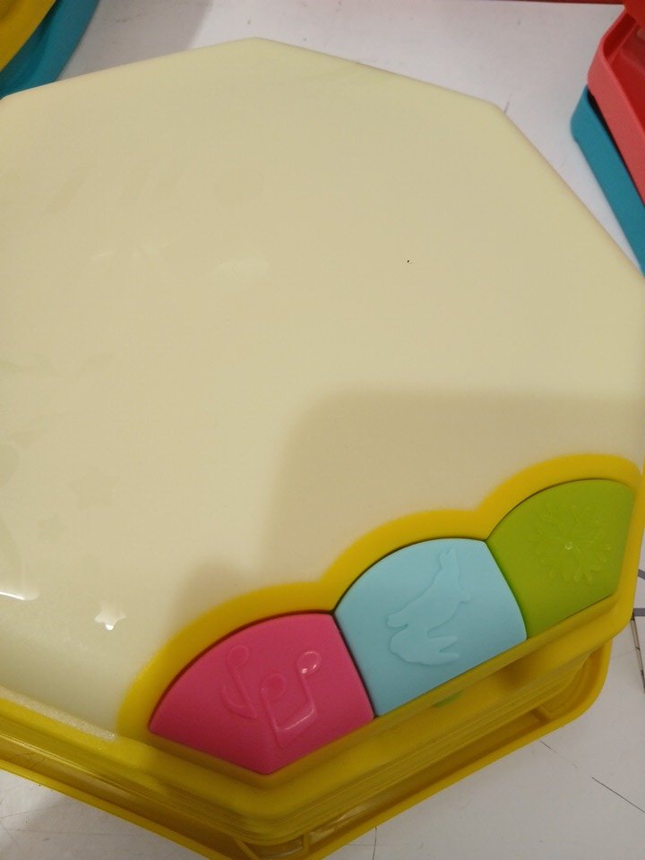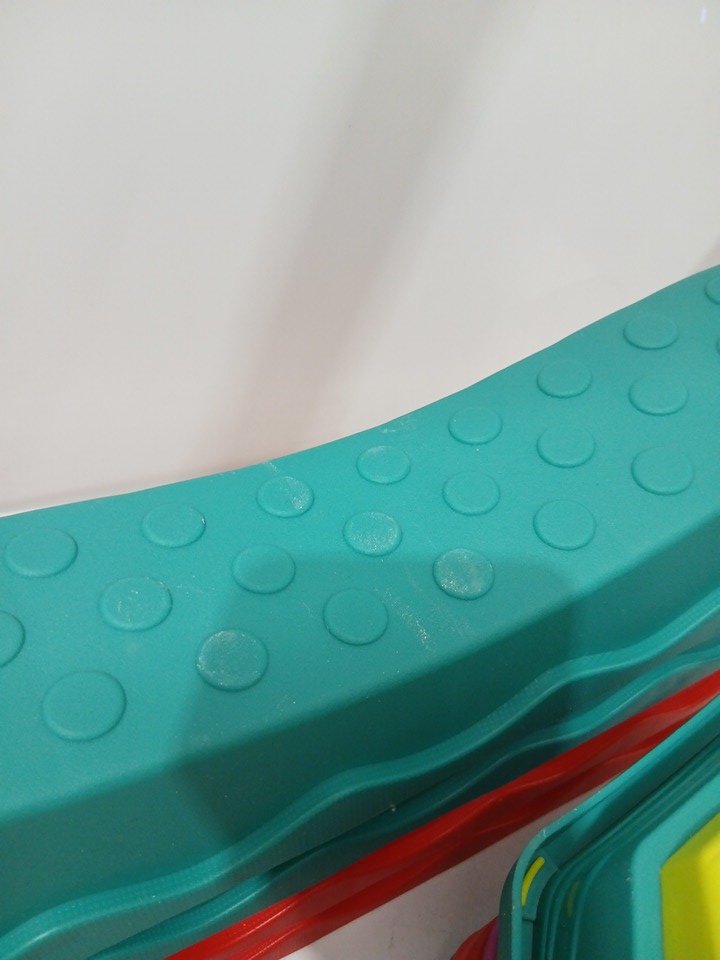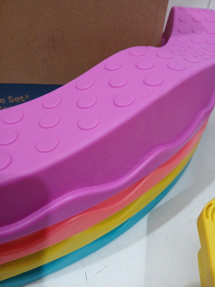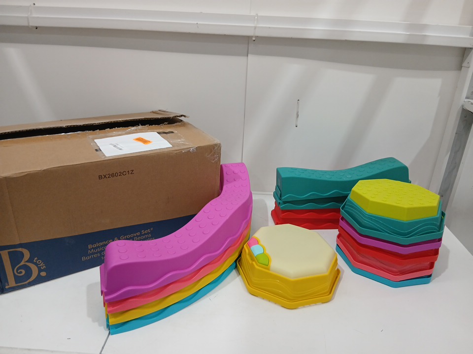 item appears used due to some dust and scratches on beams. the musical pod appears to not be functional, no music or light emits from the product when turned on and good batteries are used. item is still functional as a balance beam.