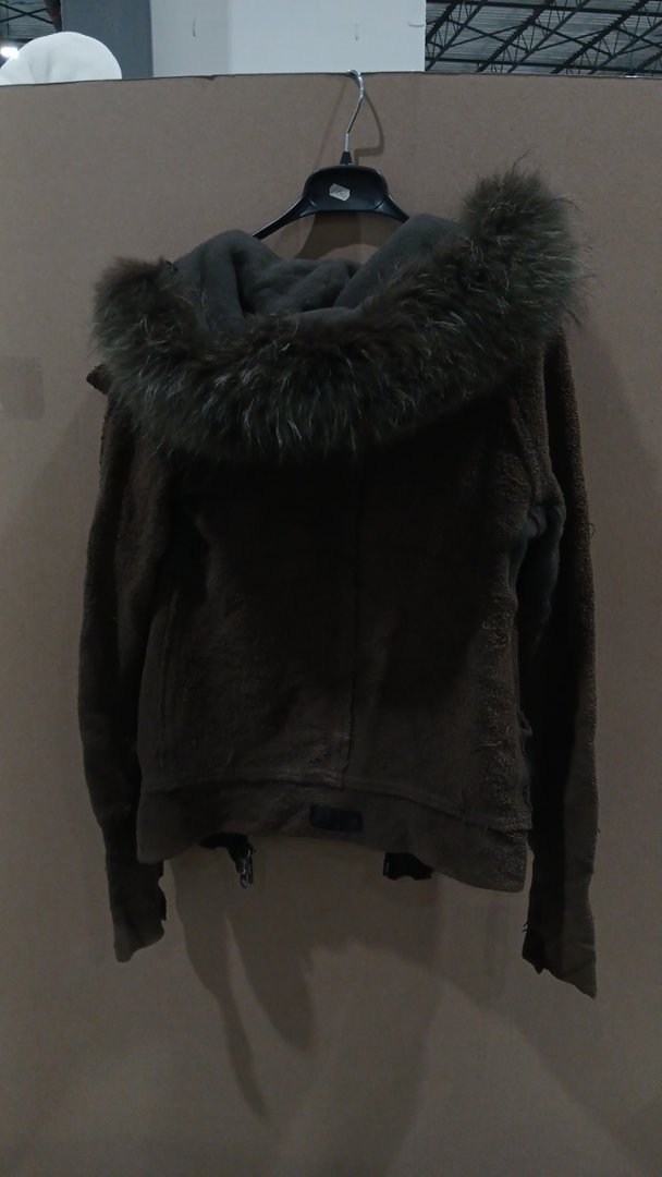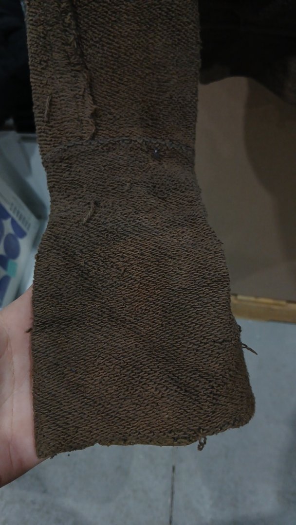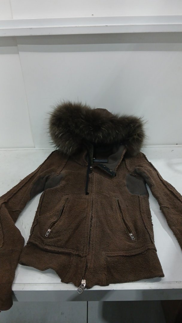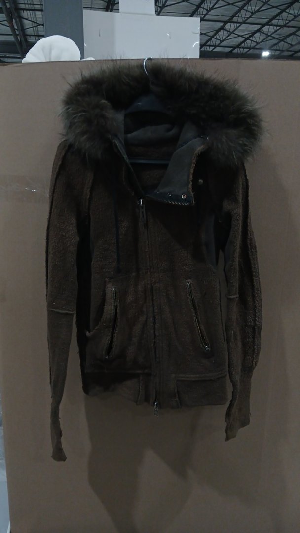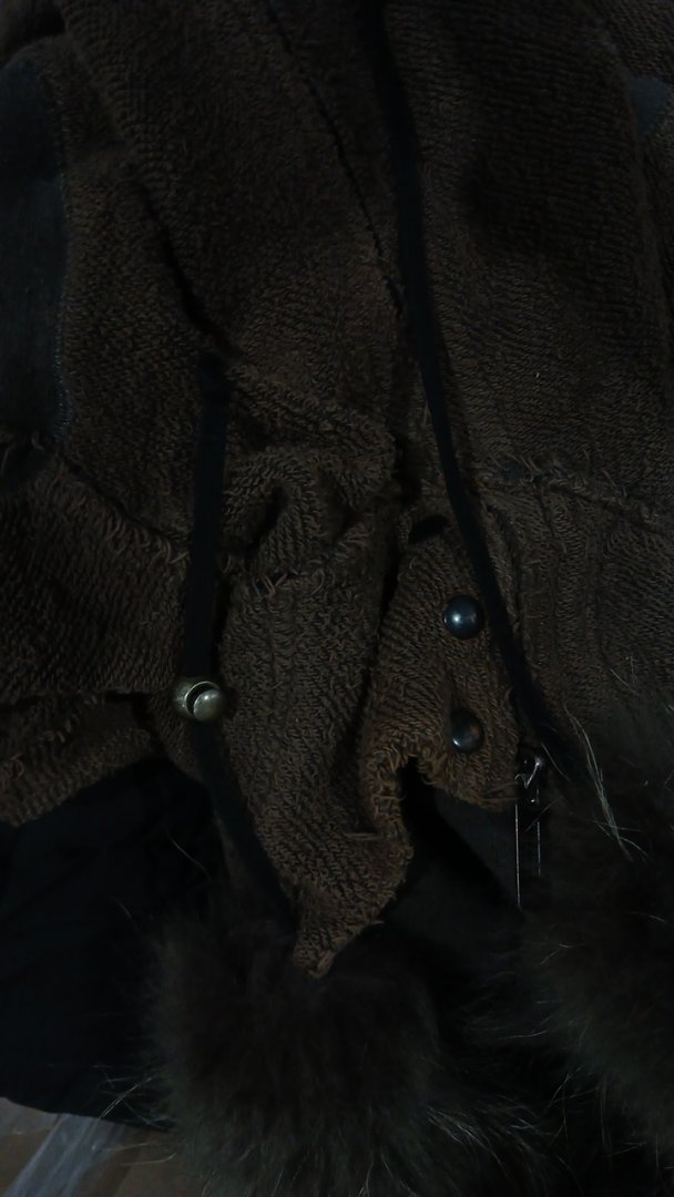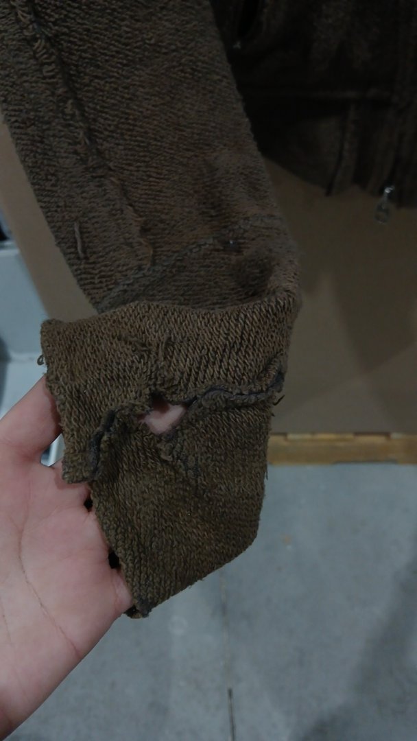 item has a significant amount of pulls and freys however this is the design of the sweater and how it is intended. Item is missing one of the caps on the strings. see photos